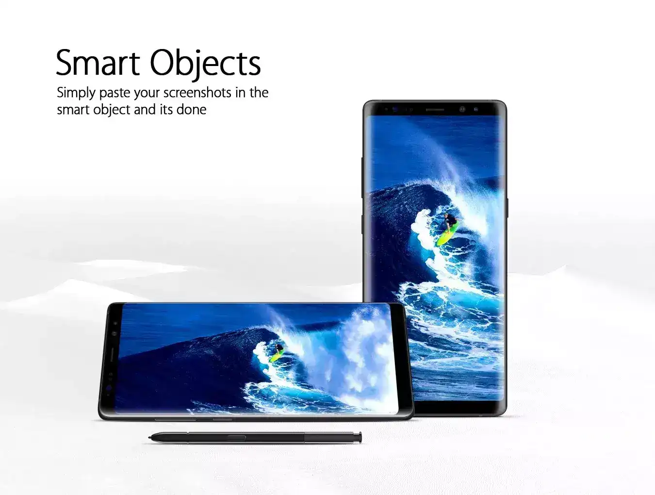 Showcase your work in style with these Samsung Galaxy Note8 smartphone mockups, save yourself time & money! This pack contains 20 high resolution PSD files with smart object features. Note - Preview images are not included!
