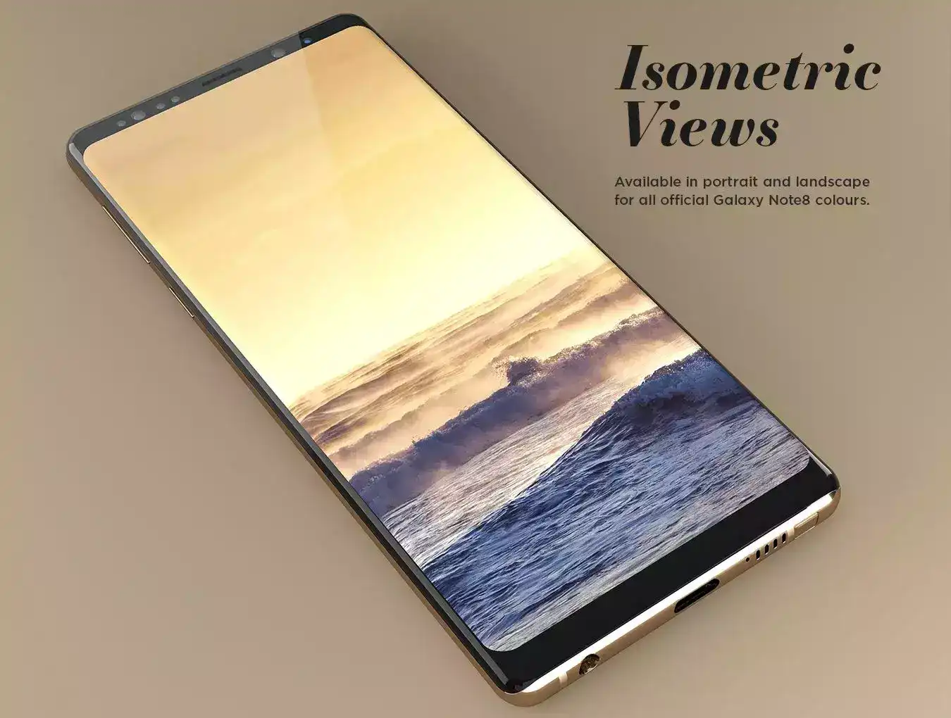 A high resolution photoshop document of the Samsung Galaxy Note 8, modelled and rendered in 3D. For app design, website and general design mockups and presentation. This item utilizes the 3D feature in Photoshop so you will need to have a version of Photoshop that supports 3D.