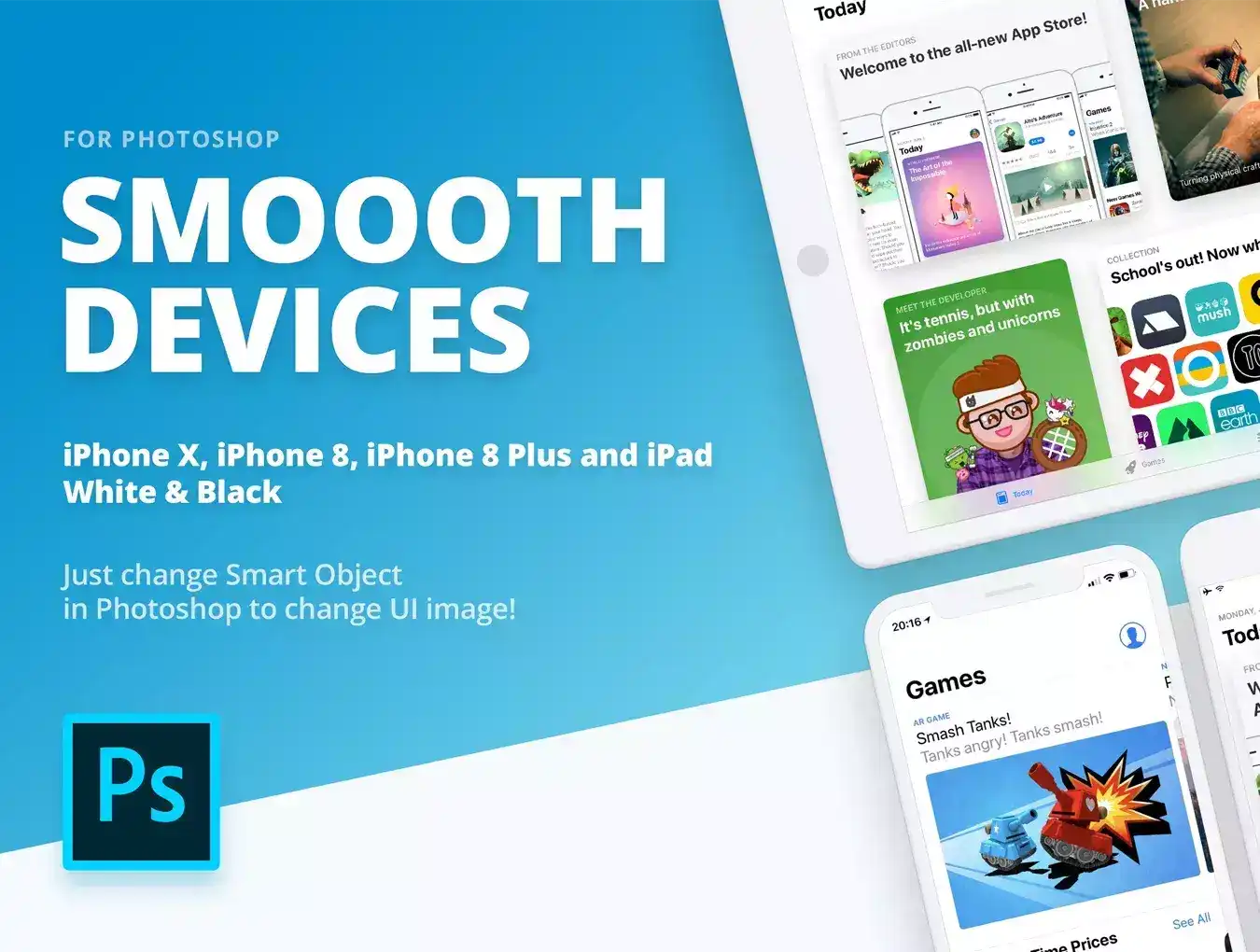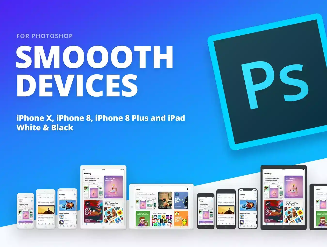 iPhone X, iPhone8, iPhone 8 Plus and iPad. 10+ different mockups with delightful gradient backgrounds. Perfect for product presentation. Easy, just change smart object in Photoshop to change UI image! Retina ready.