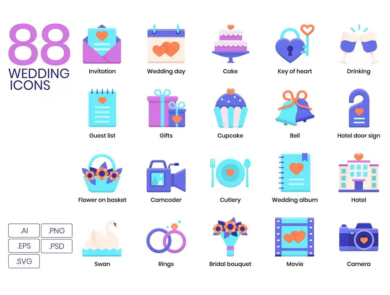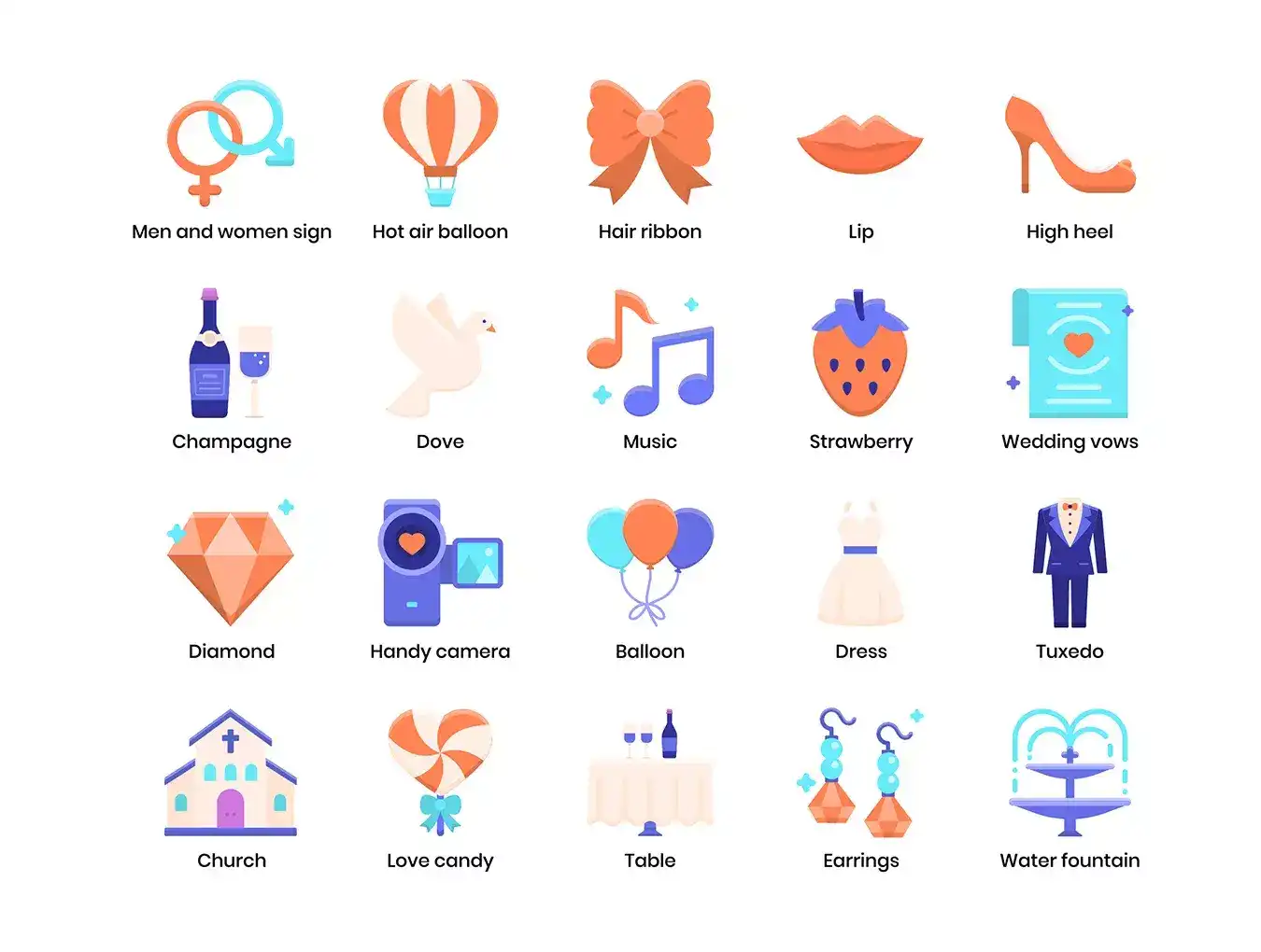 Whether you are wedding planner, bridal studio, or a pair of newly engaged couple planning for your big day, you may find these 88 Wedding Flat Icons useful for the following purposes: to announce your big day on your website, as supporting graphics on your social media such as Facebook Page, Instagram Story Cover, Pinterest Graphics and more, to beautify your bridal agency presentation slide deck, to design eye-catching wedding infographics for your studio, as decorating element in your print based materials such as brochures, flyers, business cards and more...