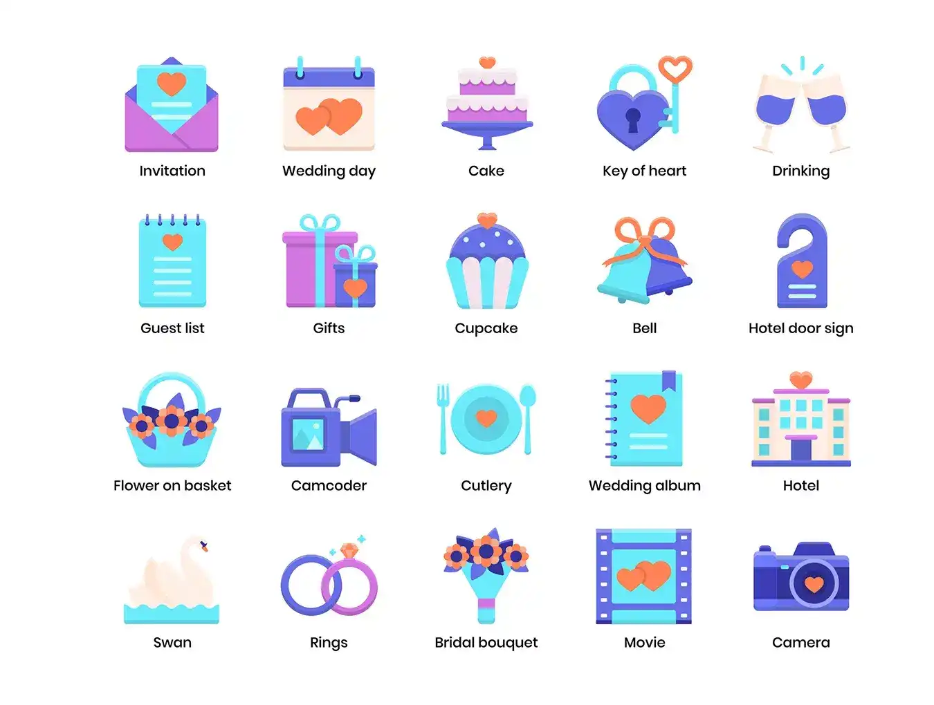 This Wedding Flat Icon Set Includes: Invitation, wedding day, cake, key of heart, drinking, guest list, gifts, cupcake, bell, hotel door sign, flower on basket, camcorder, cutlery, wedding album, hotel, swan, rings, bridal bouquet, movie, camera, men and women sign, hot air balloon, hair ribbon, lip, high heel, champagne, dove, music, strawberry, wedding vows, diamond, handy camera, balloon, dress, tuxedo, church, love candy, table, earrings, water fountain, candles, car, cupid, celebration, photos, menu, wedding bike, love chemistry, brougham, honeymoon, goodie bag, proposal, rainbow of love, teddy bear, gift, dj, gramophone, firework, decoration, live music, tag, sign, beer, caring, petards, marriage contract, men shoes, pendant, chat, hotel keys, just married, tent, make up, wedding bed, thank you card, love sign, men sign, women sign, champagne stack, holly bible, groom, bride, wedding location, groom and groom, bride and bride, wedding doves, bride and groom.