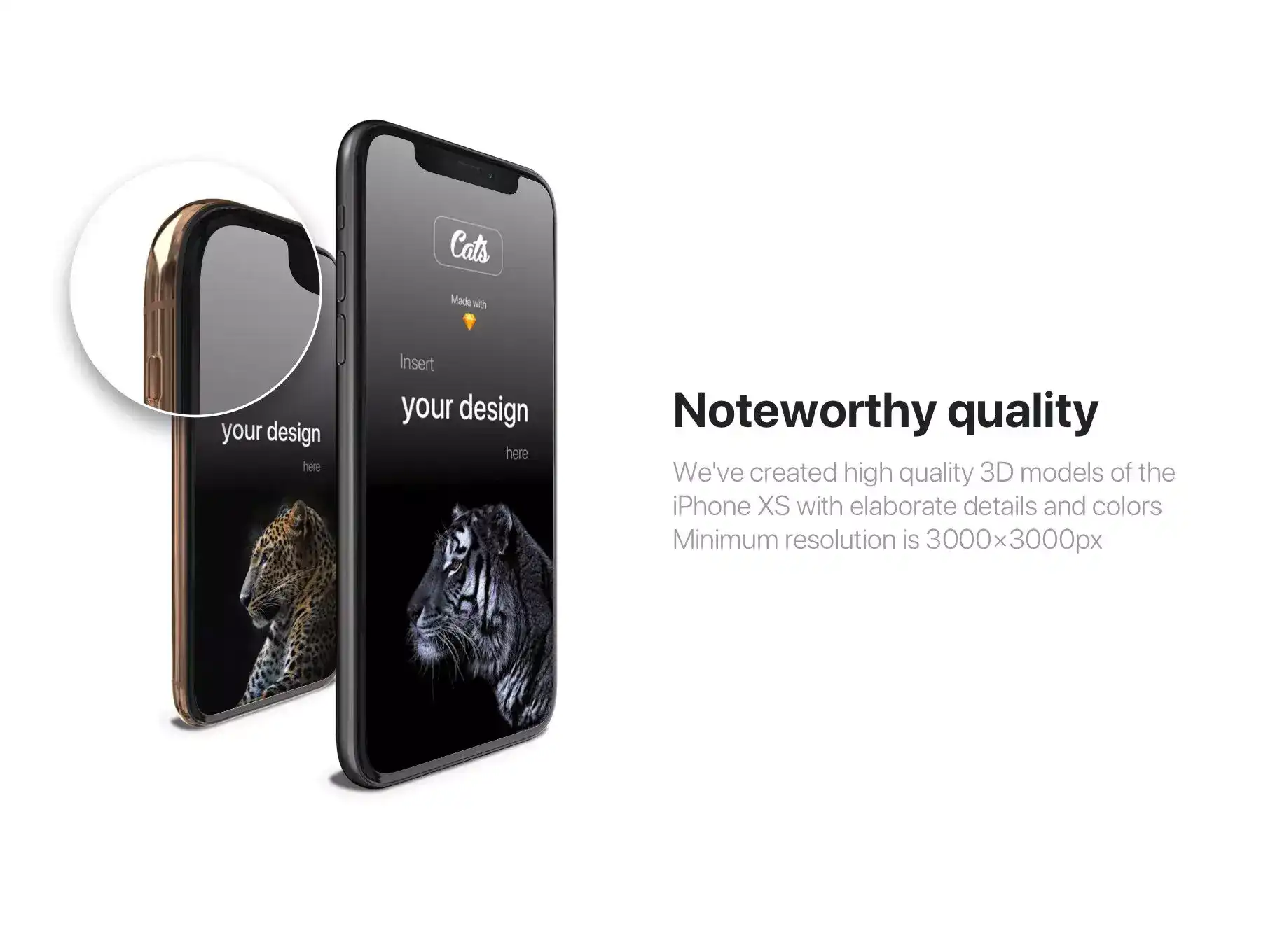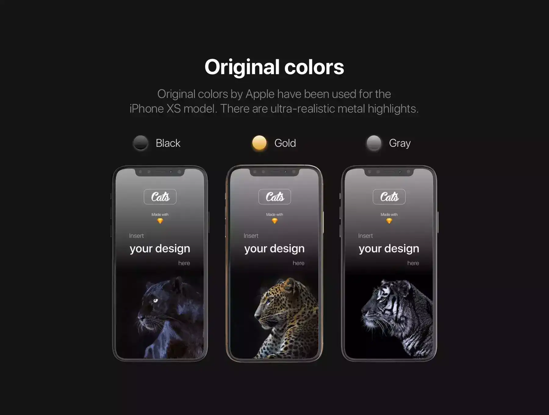 There are 21 ready-to-use mockups of the new iPhone XS. All models are created in original colors by Apple (black, gray and gold) of high quality. It can be used in Sketch with the Magic Mirror plug-in. Just change the screen and your product will become interesting, unique and modern.