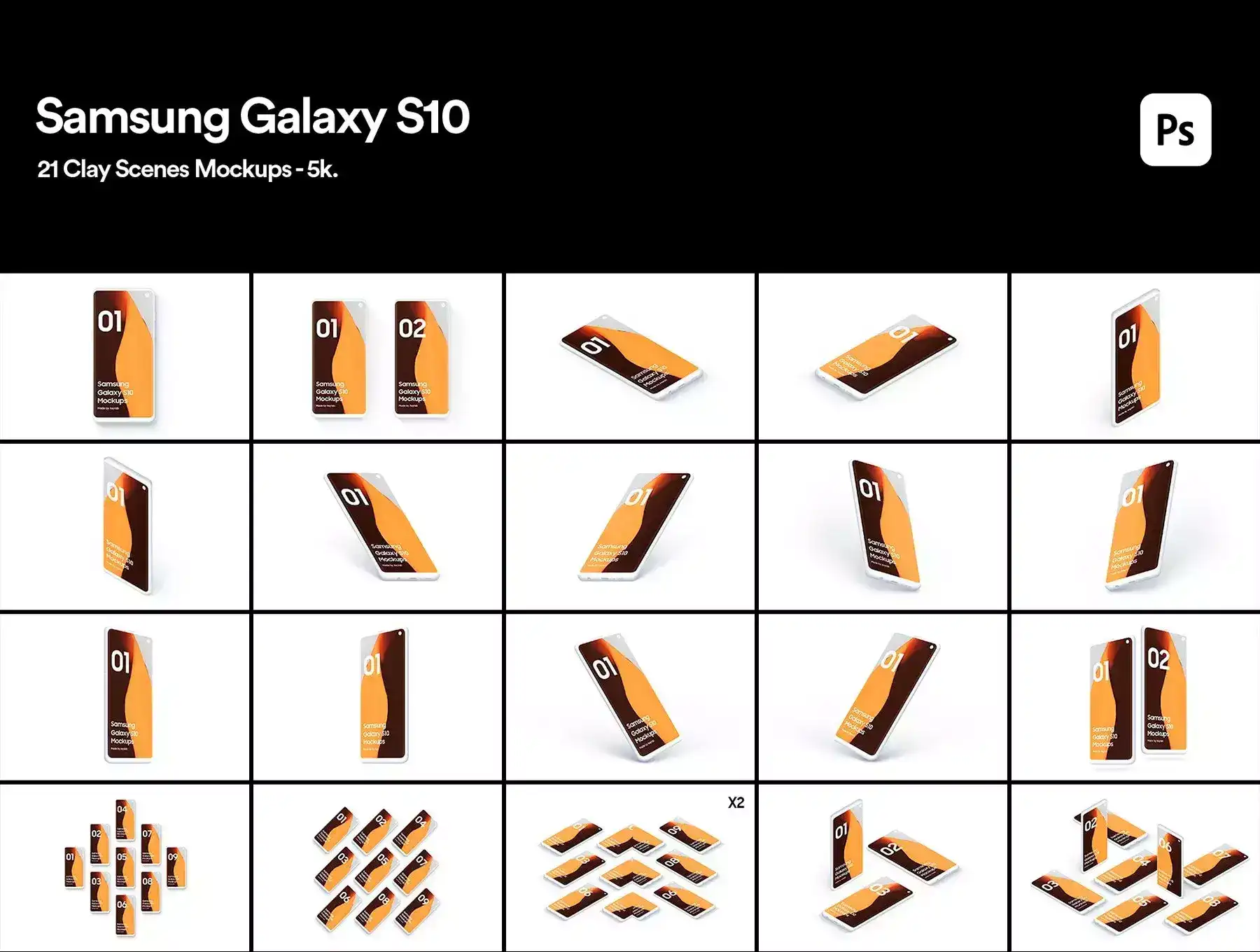 - Includes 21 Samsung Galaxy S10 Clay Scenes PSD high quality files (All the scenes that you will see they already included in the purchase).