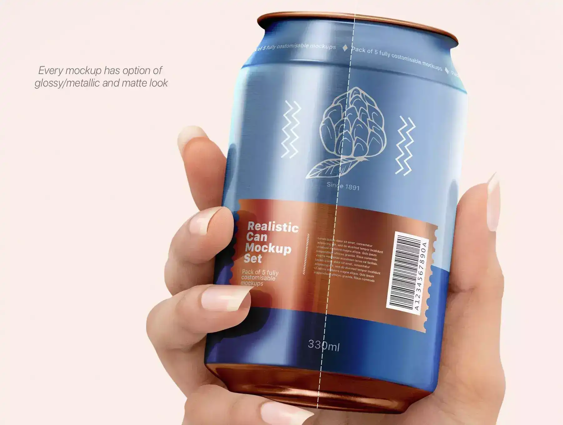 Be creative with your packaging design with this Realistic Can Mockup Set, this will be a beautiful addition into your library to showcase your upcoming design. Fully customisable pack of 5 mockups with multiple features to customise.