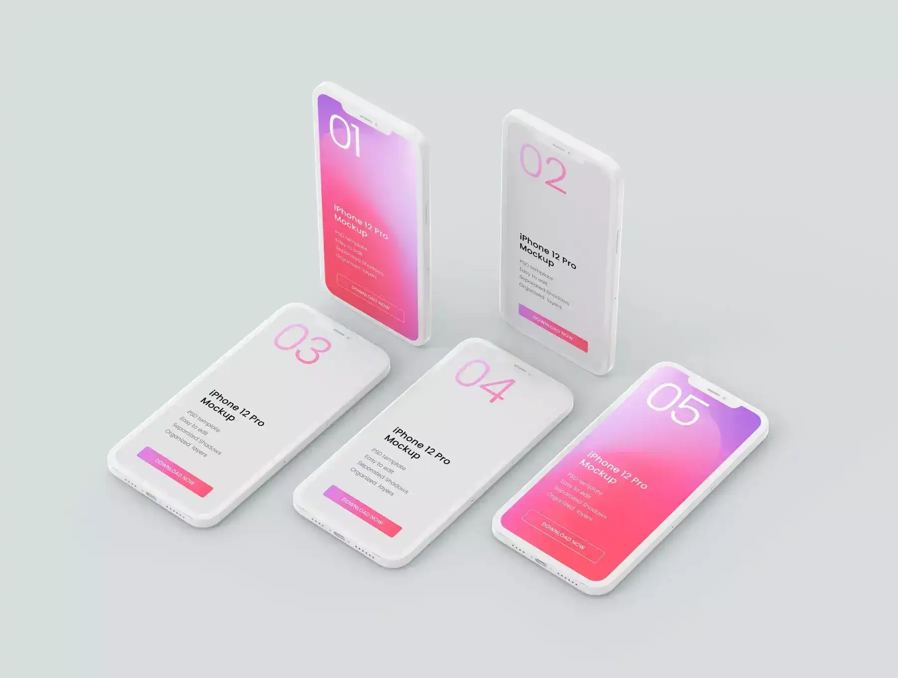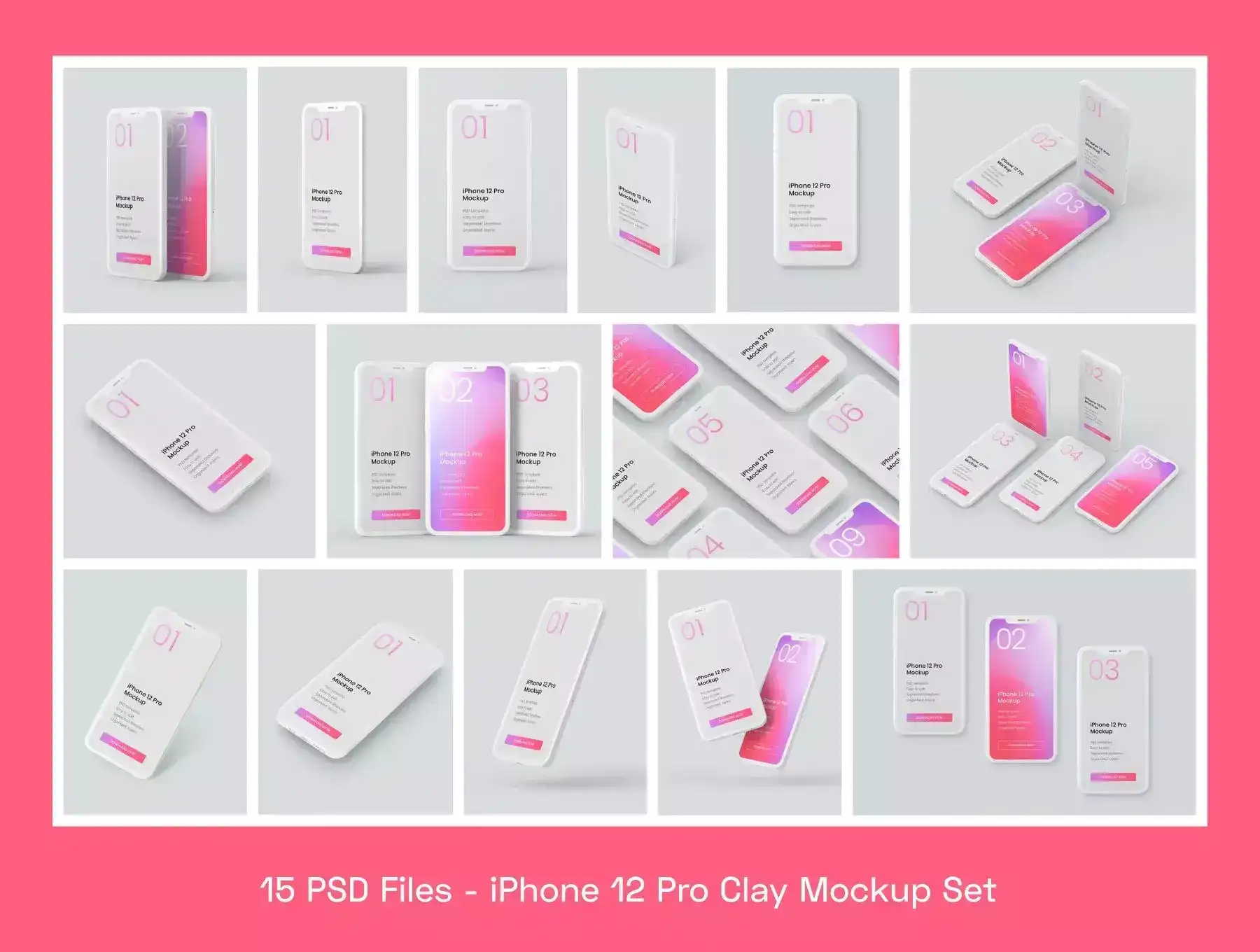 Fresh, new, advanced clay iPhone 12 Pro Mockup Bundle for use app, web design that contains 15 different arrangements and perspective angles. The mockup scene generator includes the iPhone, a smartphone with fully customizable colors, shadows, and smart objects. You can use it for social media posts like Instagram, to spice up your portfolio on your website, or Behance and dribbble projects. Also usable for print purposes due to its high-resolution.