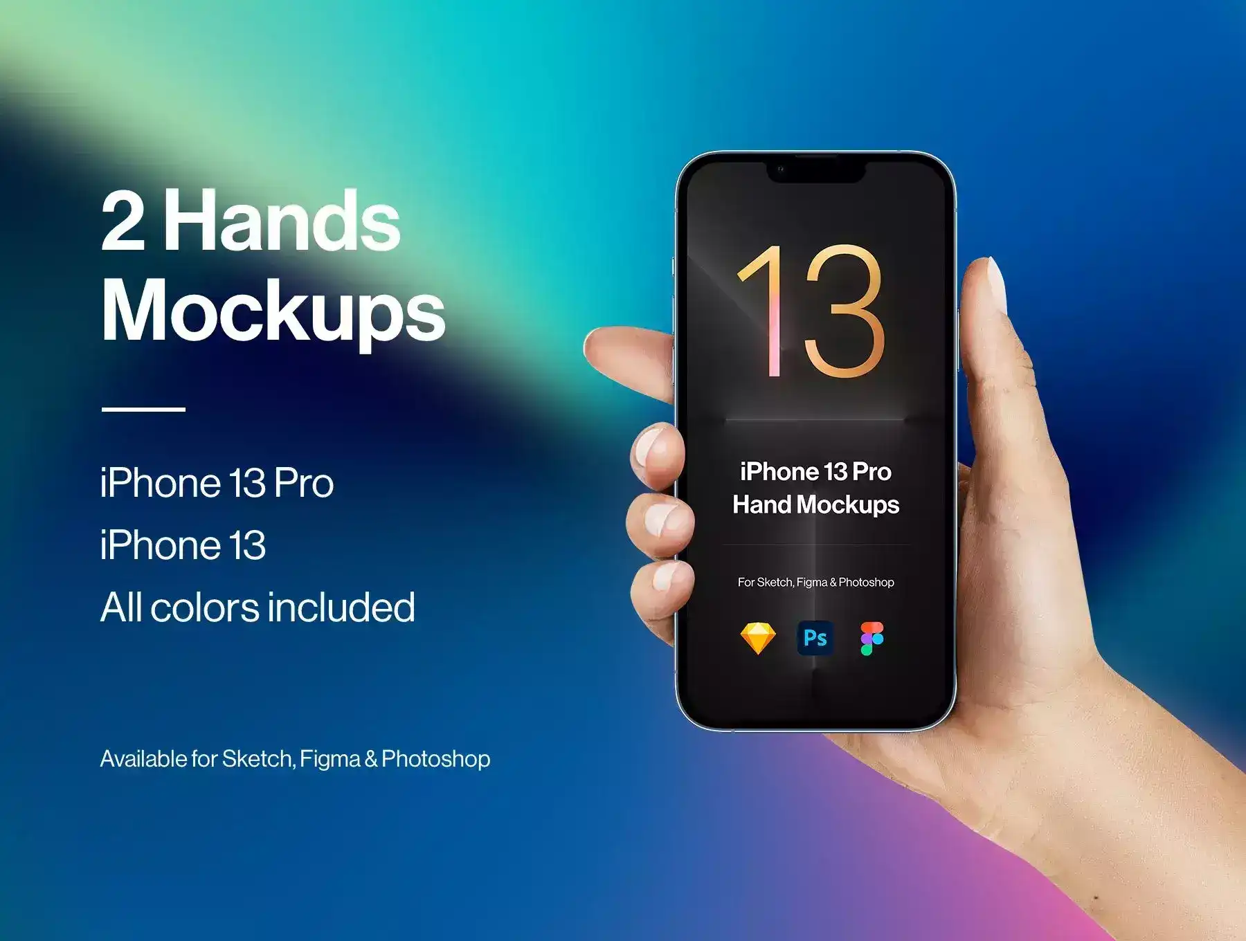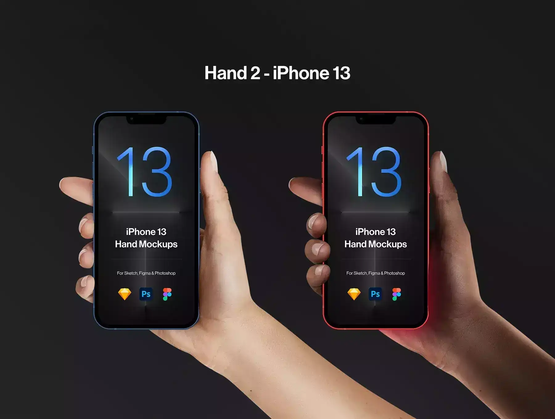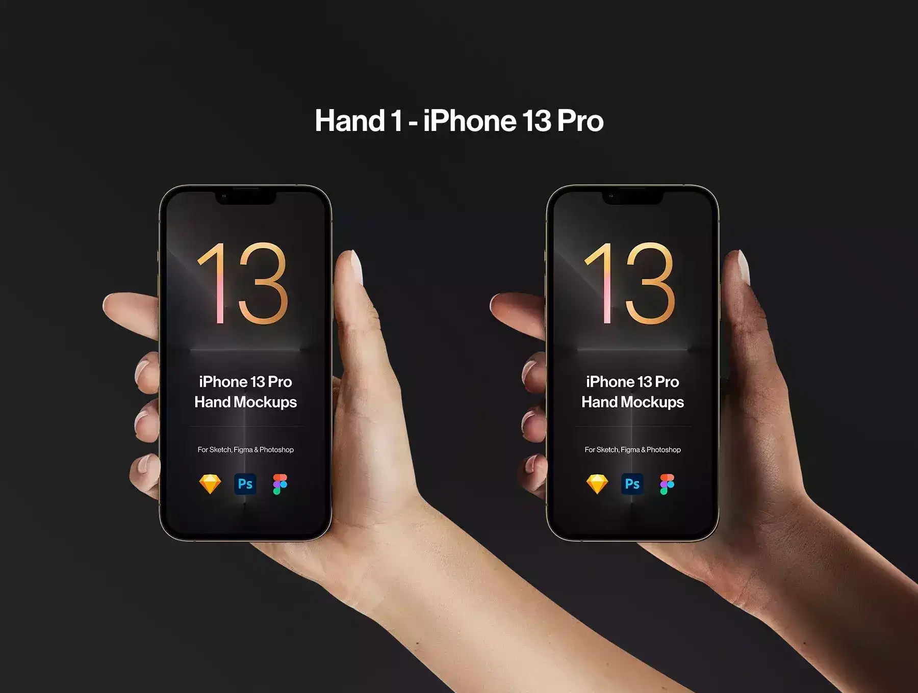 Brand New iPhone 13! iPhone 13 Pro, Mockups on transparent background. Awesome pack of customisable templates with brand new iPhone 13 Pro, iPhone 13. Exclusive 2 female hands with light & dark variation. Easy to customize. High quality mockups to create the perfect presentation for your design. Compatible with Sketch, Figma and Photoshop CS/CC.