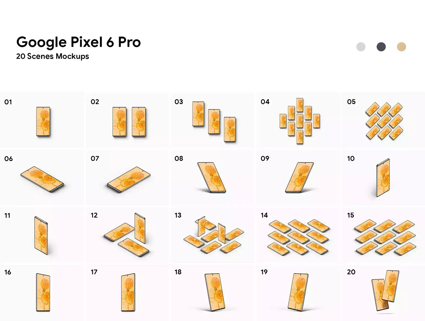 Includes 20 Mockups Scenes of Google Pixel 6 Pro PSD high-quality files (All the scenes that you will see in the 2nd picture they already included in the purchase).