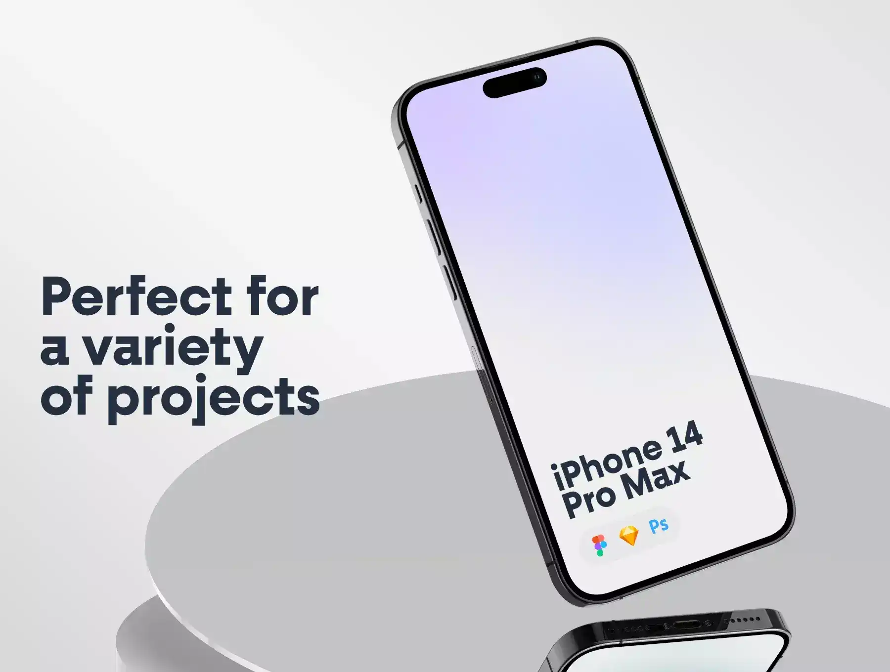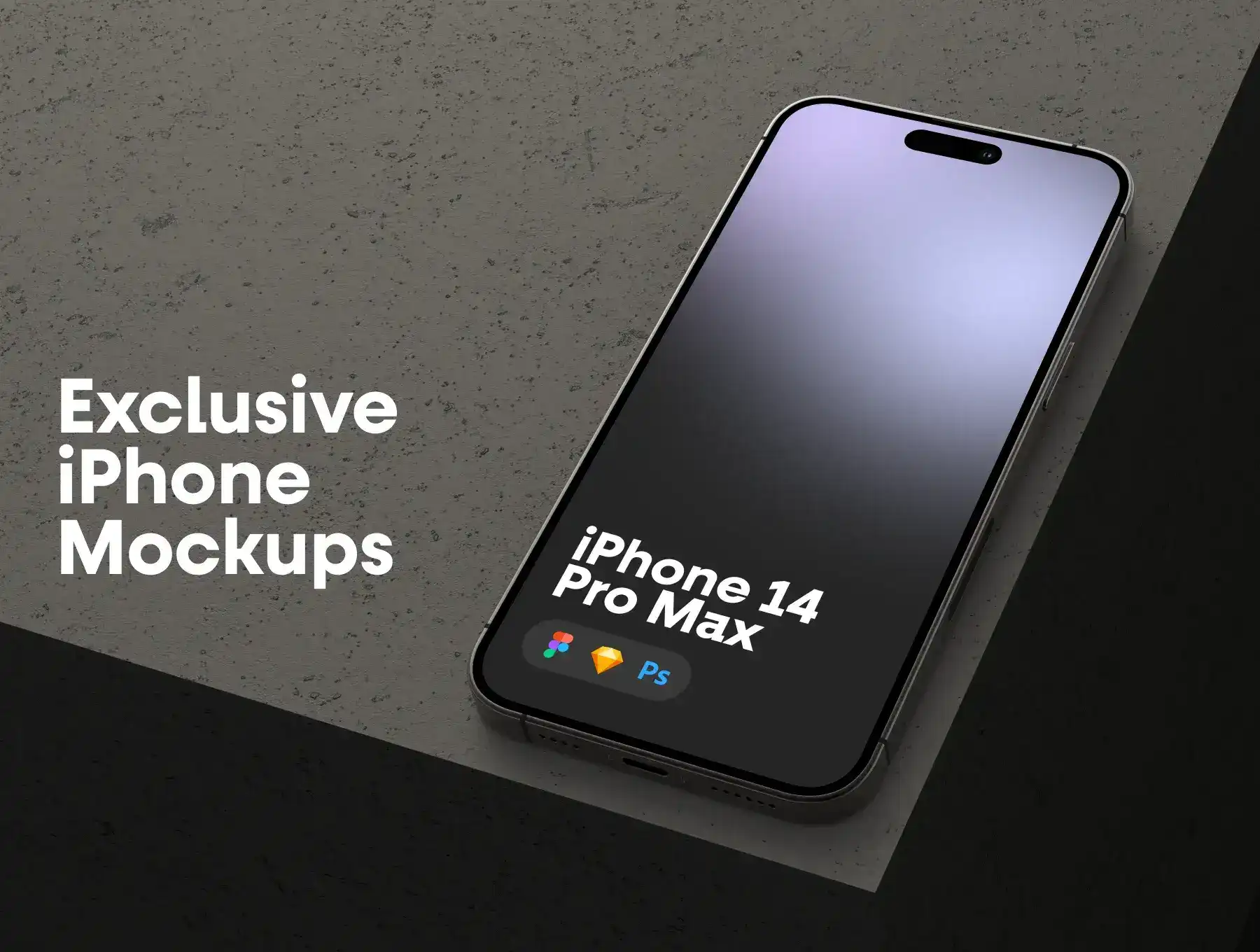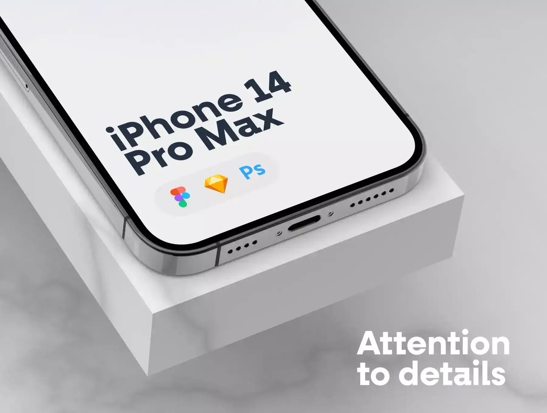 These iPhone 14 Pro Max mockups will help you save lots of time and effort since they are coming with a pre-made background. You can pick from 16 different scenes done in 4K resolution to create eye-catching concepts. Thanks to the minimalistic composition, you can use the mockups for a variety of concepts: social media, retail, healthcare, and others. They are suitable for Photoshop, Figma, and Sketch.