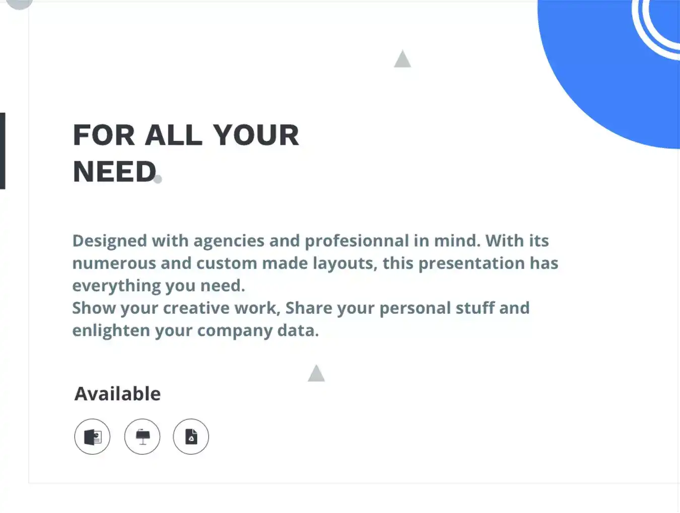A powerful & creative slide presentation available for PowerPoint, Keynote and Google Slides. It comes with 99+ unique presentation slides with great professional layout and creative design.