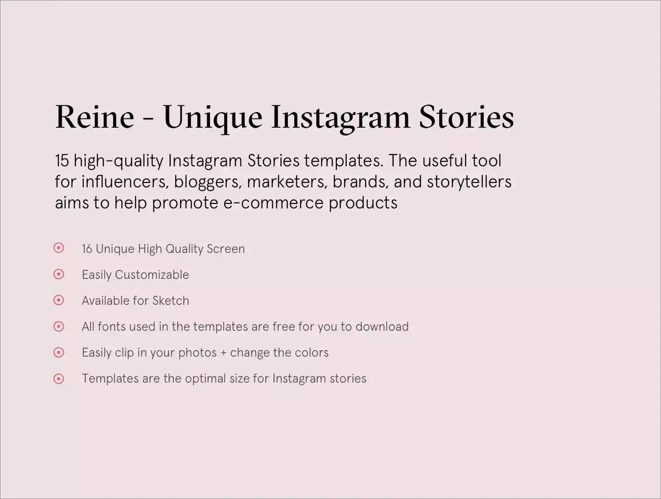 Reine is 15 high-quality Instagram Stories templates. The useful for influencers, bloggers, marketers, brands, and storytellers aims to help promote e-commerce products, share deals and announcements or attract the attention of your followers. Everyone's using Instagram stories these days, and they can be a great way to boost your online presence. We're here to help you make them pretty with this easy-to-edit, fully customizable Instagram story templates.