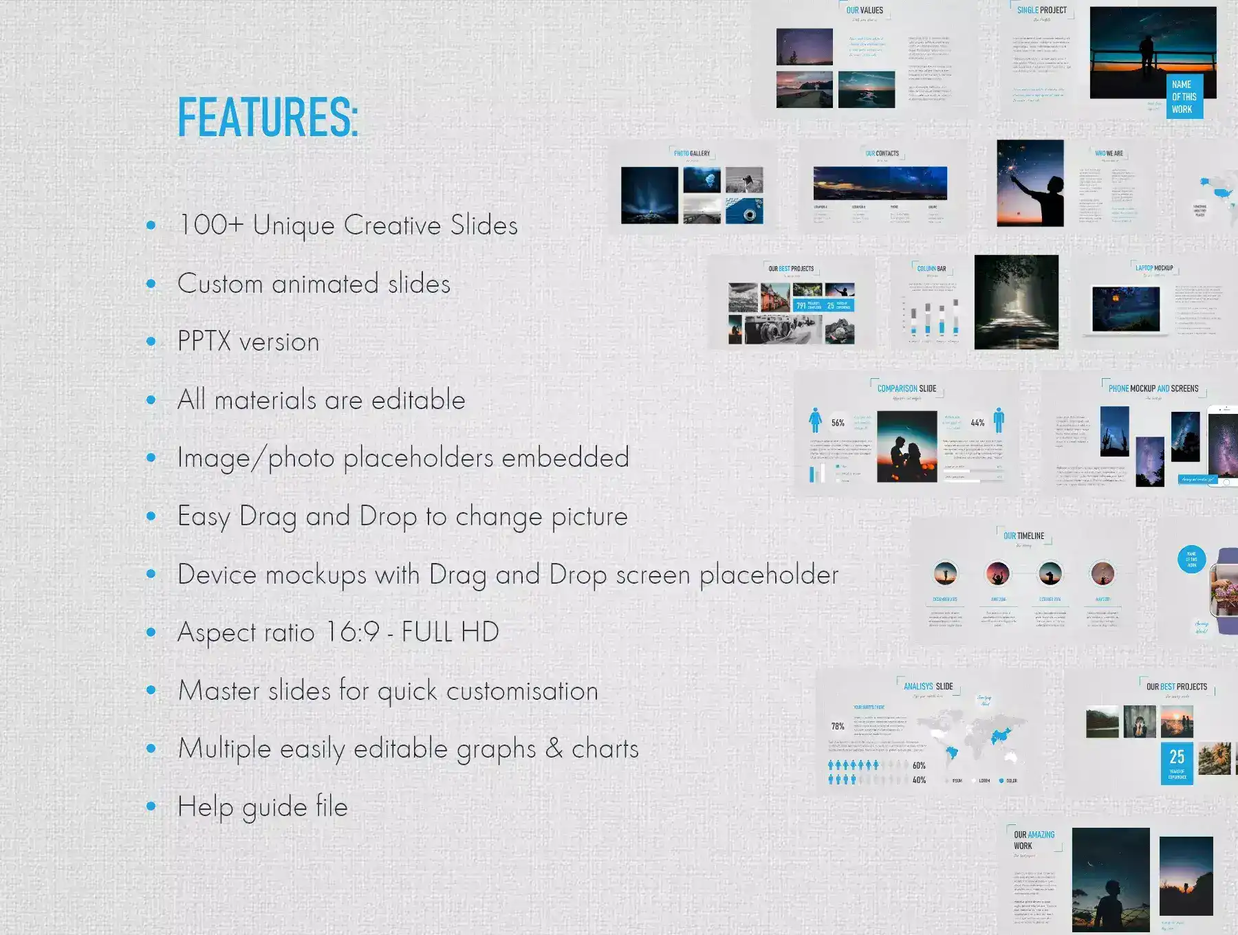 This template has a variety of great features including creative photo placeholders, overlays, diagrams, maps, mockups and much more! You can edit everything very easy in PowerPoint.