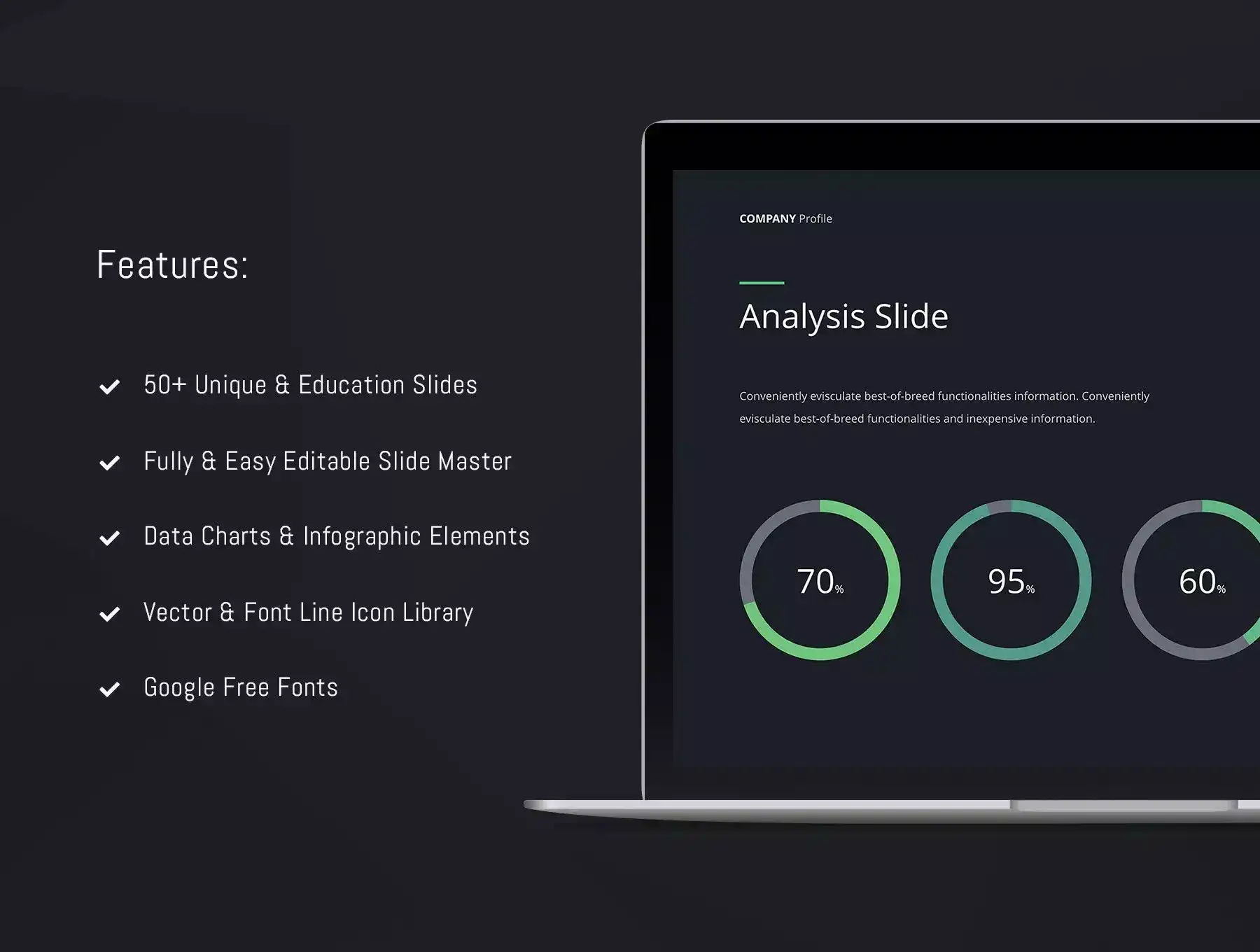 “Company Profile” is a multipurpose & business Presentation template. Since the beginning of the creation of this template, we focused on the real use, good readability and meaningful suggestions of all slides. We have devoted time testing in keynote where we managed to tune many details. In cooperation with designers, we have prepared modern colors that are used in Web design and bring you trend insights. Great animation deliver dynamic and make your presentation interesting and unique. If you were a manager, who wants to present the potential of a company, a lecturer who is eager to attract attention, or a student who wants to present a report – don’t hesitate, this product is developed just for you!