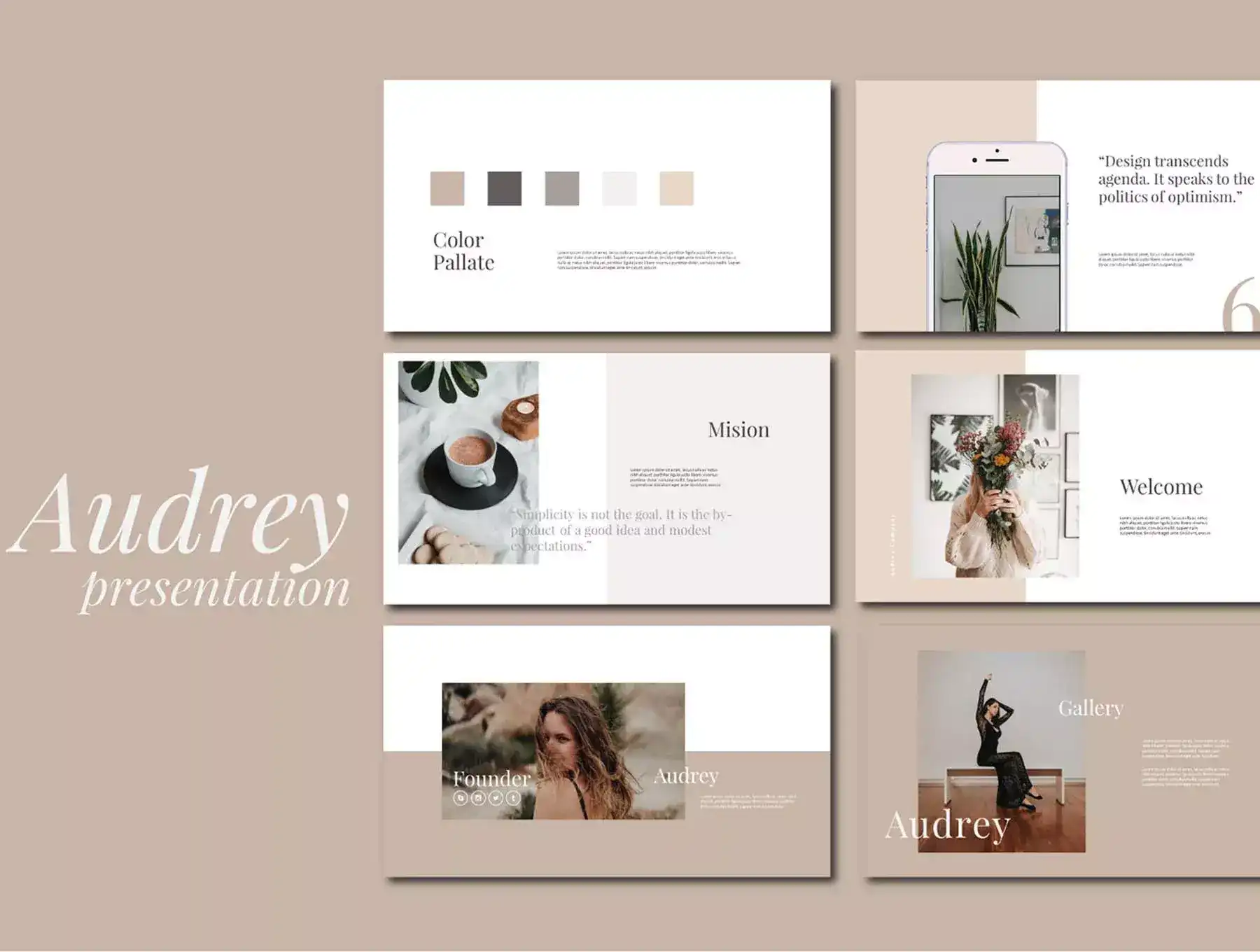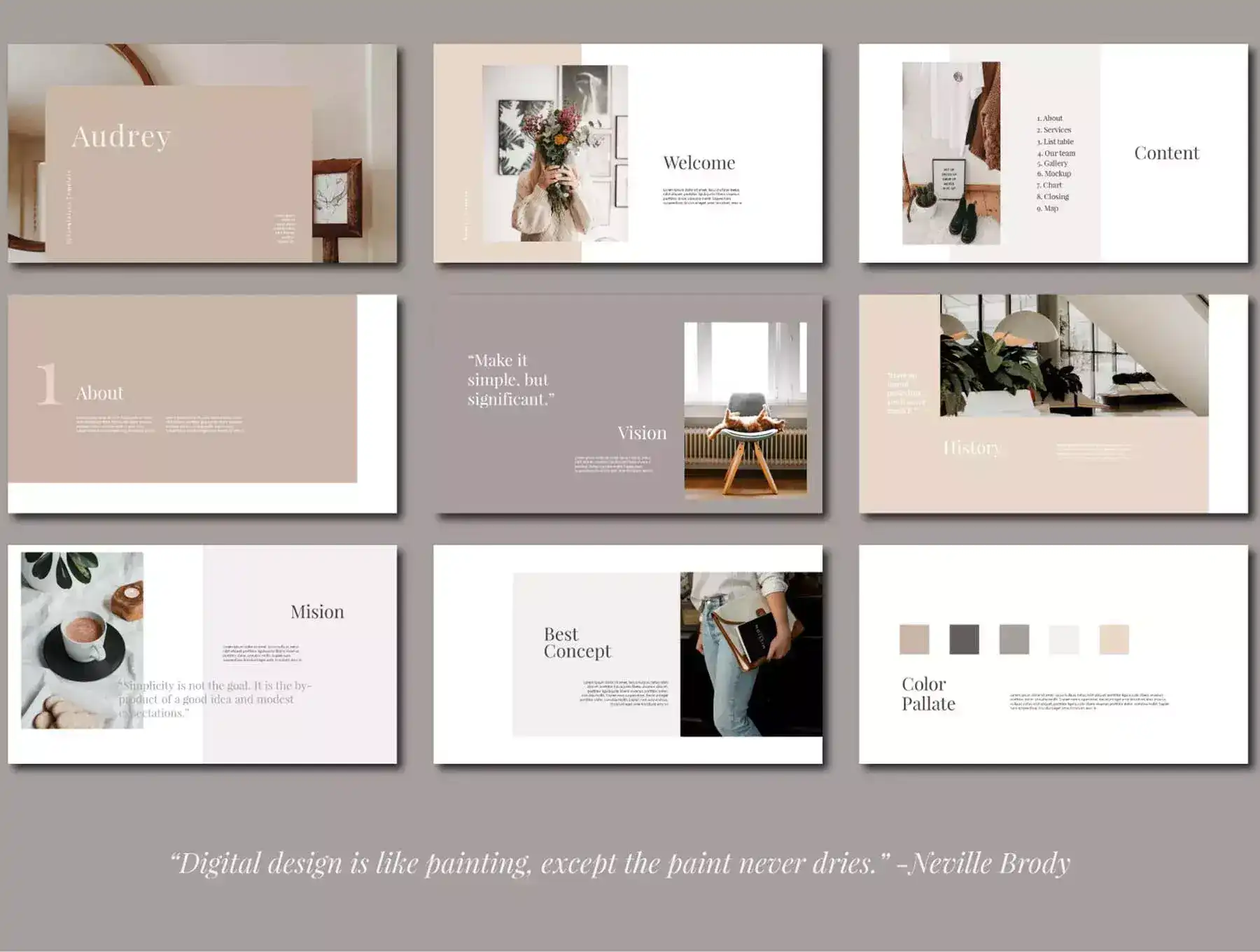Audrey is minimal brand guidelines Google Slides /Full. Every slide is unique and not just repetitive layout. Just use powerpoint you can create gorgeous brand guidelines for your brand, it's perfect for digital brand guidelines, marketing kit or for brand presentation. And Audrey Google Slides Template now you can create a powerful and professional deck with a striking design in just a few minutes instead of hours (or even days).