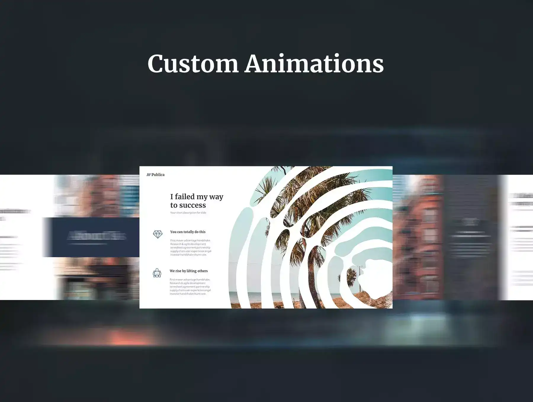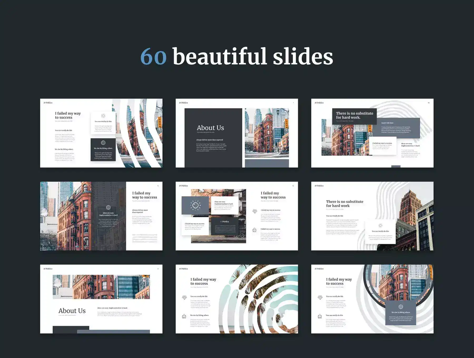 Publica is a perfect template for any kind of presentation and with a choice of 60 fully animated slides, your presentation will be anything but boring. All shapes, elements, icons are 100% vector editable and easy to change size and colors.
