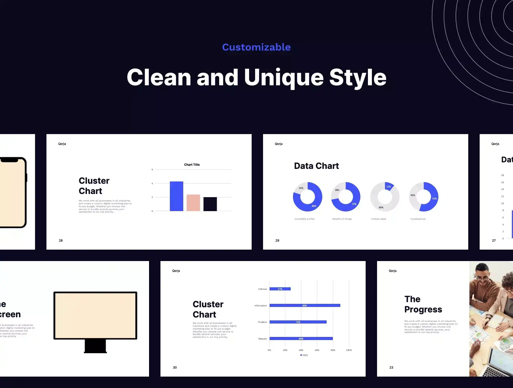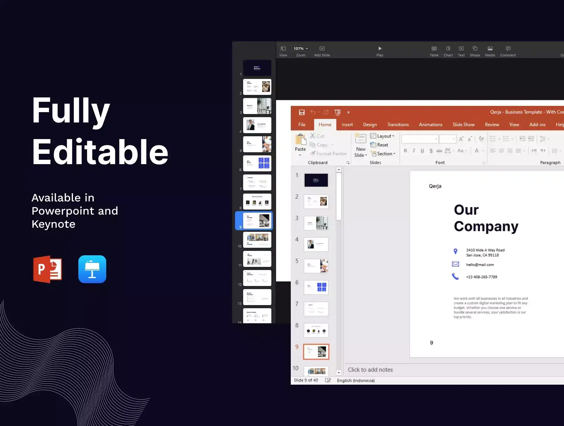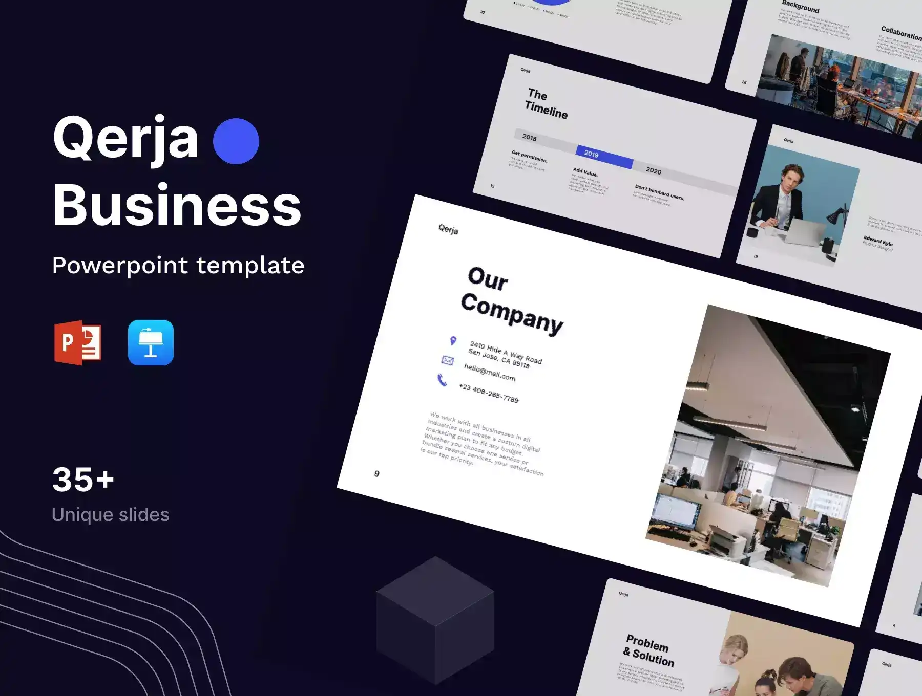 Create your awesome presentation easily with Qerja. Qerja is a creative PowerPoint and Keynote template for the business industry. You can create a professional deck with a clean design in just a few minutes.