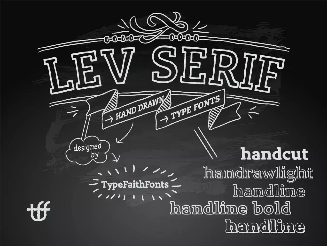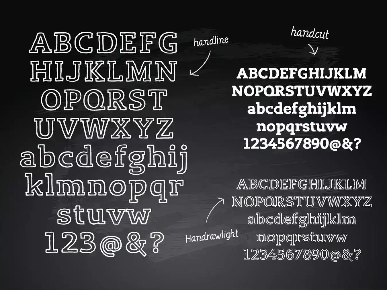 A hip and bold hand-drawn variation of Lev Serif with three different line weights; handcut, handrawlight, and handline.