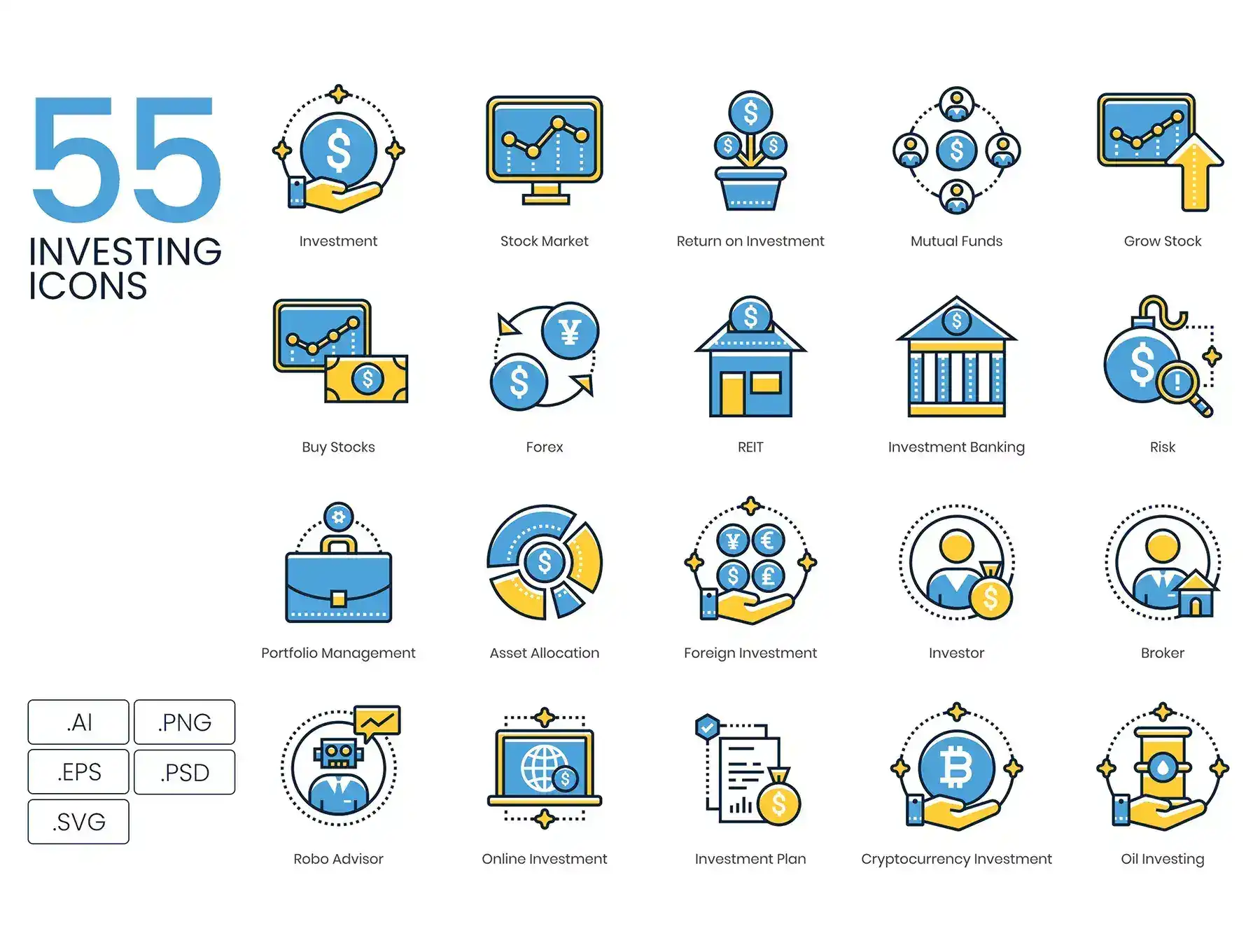 If you want to dive in deep in the world of investing, or you would like to share that hard earned knowledge to other people, why not start here? We have **55 Investment Icons** just for you! It’s somewhat easier to explain things with a visual aid too, right? And of course, you can use these icons in an app or website. Should you choose to open a service that will help people, these 55 Investment Icons will be invaluable! These icons are so versatile that your imagination’s the limit!
