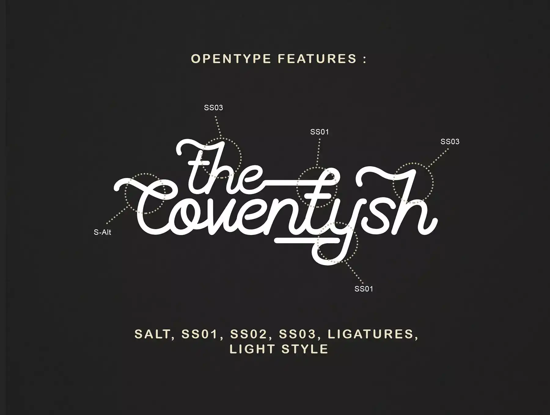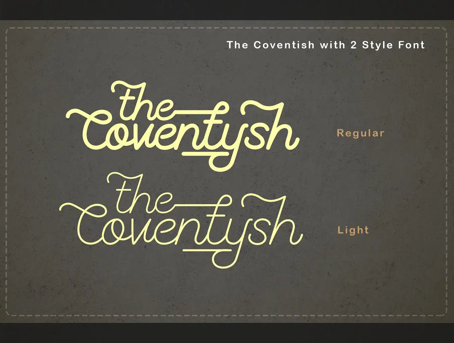 The Coventysh is a beautiful and Elegant Mono-Line Script Font, Available 2 weight styles are perfect for Logo Design, Branding, Clothing Design, Signage, Poster, Wedding Invitations and so much more! My goal for this font was to create an easy-to-read Monoline Font Script that serves a variety of purposes. The Coventysh, has a handcrafted feel and natural touch then tidied up to create a consistent character set. It is perfect for your creative projects.
