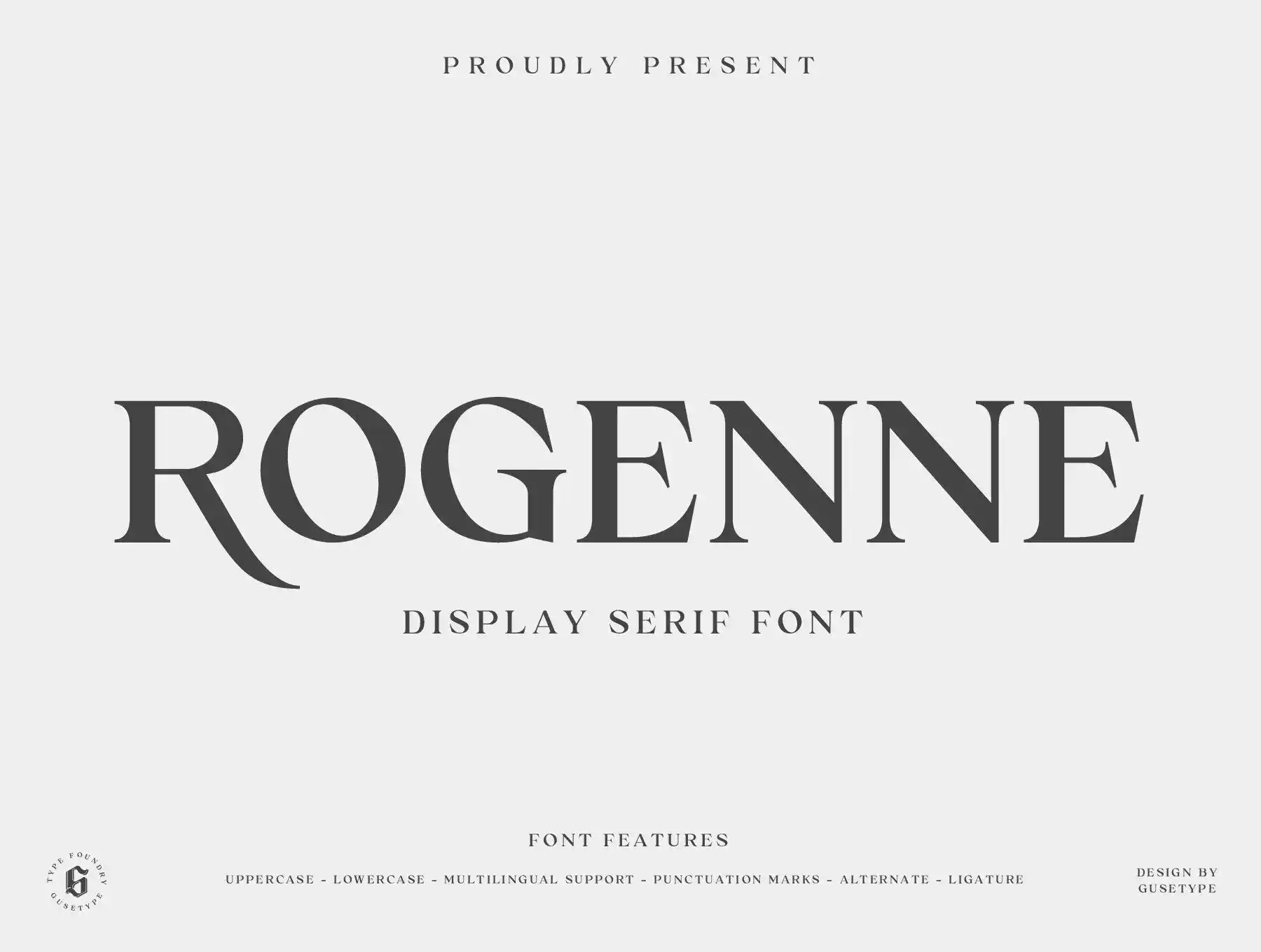 Rogenne is a display serif font. Rogenne font also have elegant touch in every single character there make look more classy and luxury. This font has alternate and ligature features which are good for stylizing your text for completing various projects such as banners, brochure, logos, products, labels, websites, posters, brands and many more.