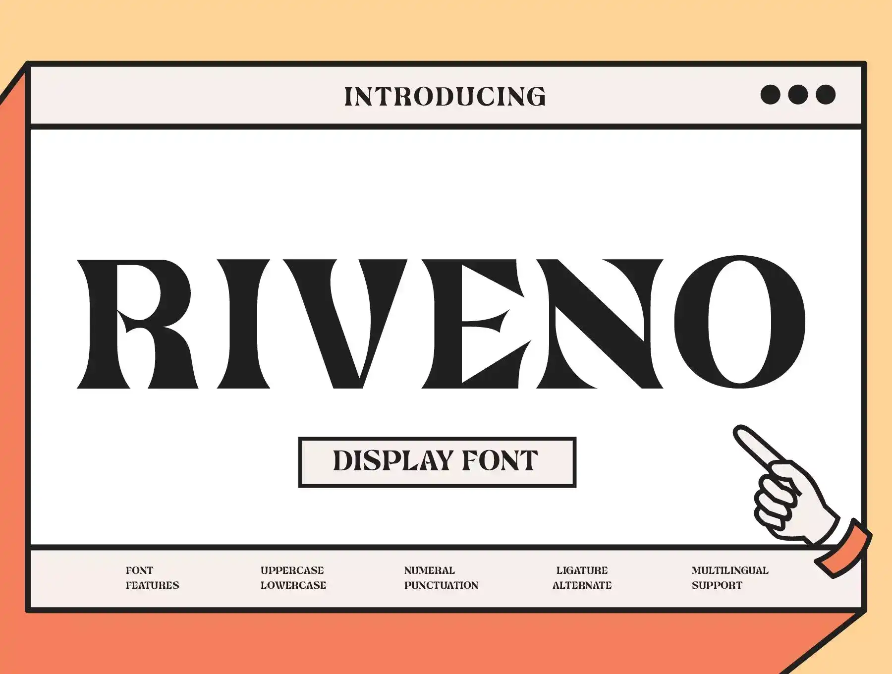 Riveno is a display font with sharp edge. This font can be used in a various of designs such as headlines, cover, poster, logo and more. This font contains uppercase, lowercase, numeral, punctuation marks, multilingual support and this font has ligature & alternate features that can make your typeface look more stylish.