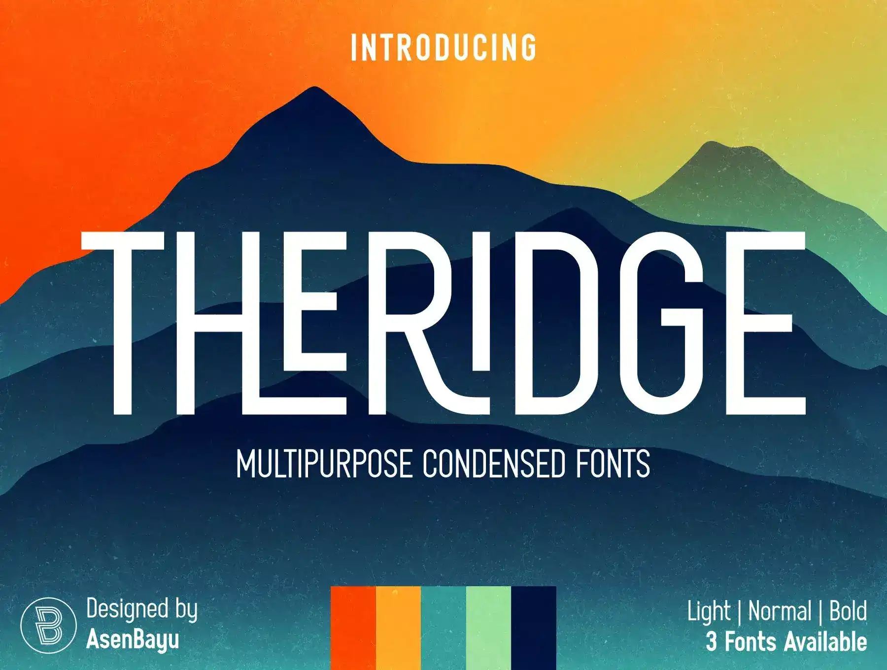 Theridge is a multipurpose condensed font that's clean, neat and attractive. Inspired by hiking trips and forest views, Theridge represents a sense of clean highland adventure. These fonts themed retro, adventure, urban, hipster, vintage but still modern. These fonts are great for creating desired projects like logos, posters, headlines, albums, quotes, apparel and more. These fonts are perfect for you who need clean condensed typeface!