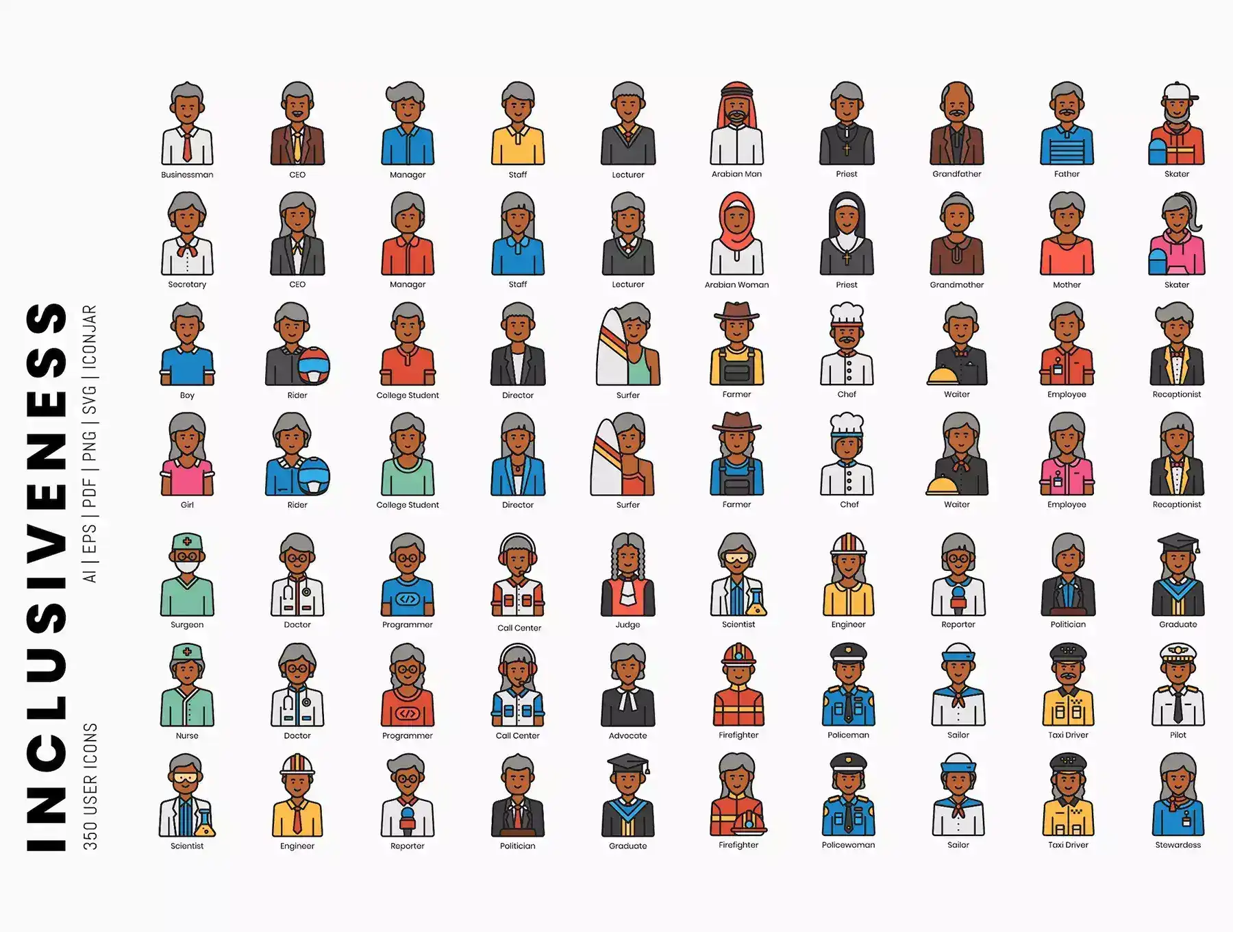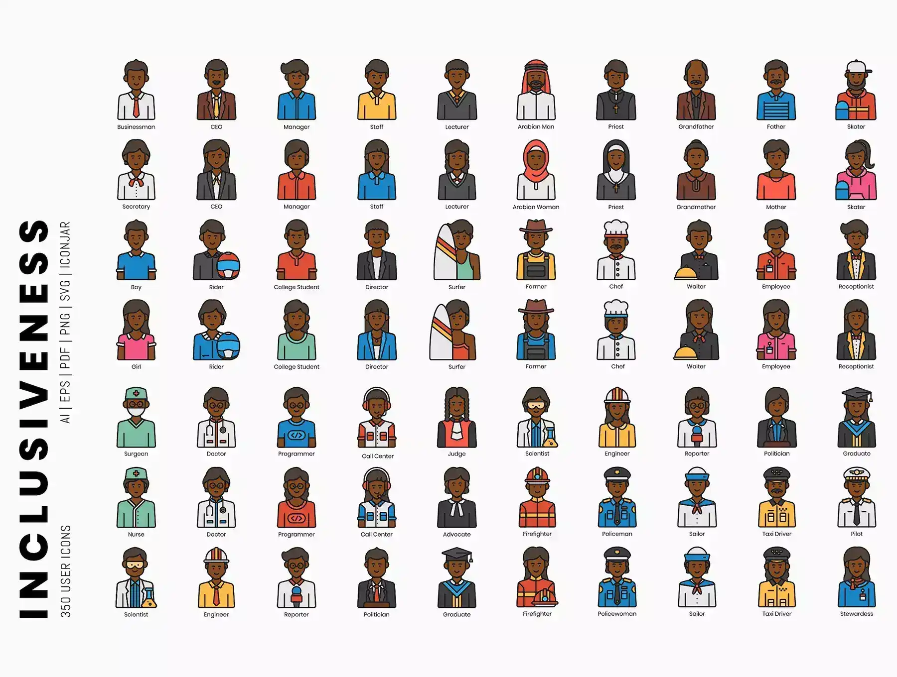 Equality - everyone deserves it, which is why we created this huge set of user icons that comes in a variety of tones, professions, and genders.
