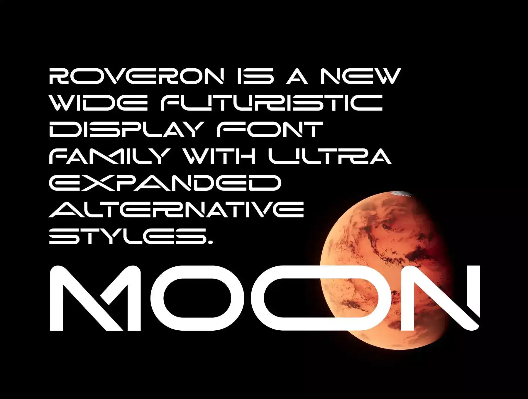 Roveron is a futuristic wide display font that has a unique geometric shape. Roveron is inspired by space explorers with a strong contemporary feel. The Roveron features a highly expanded alternative style as well as a discretionary ligature. You can use this font in a modern and sophisticated design. This font is perfect for various projects such as: logos and brand identity, headlines, posters, signs and many more.