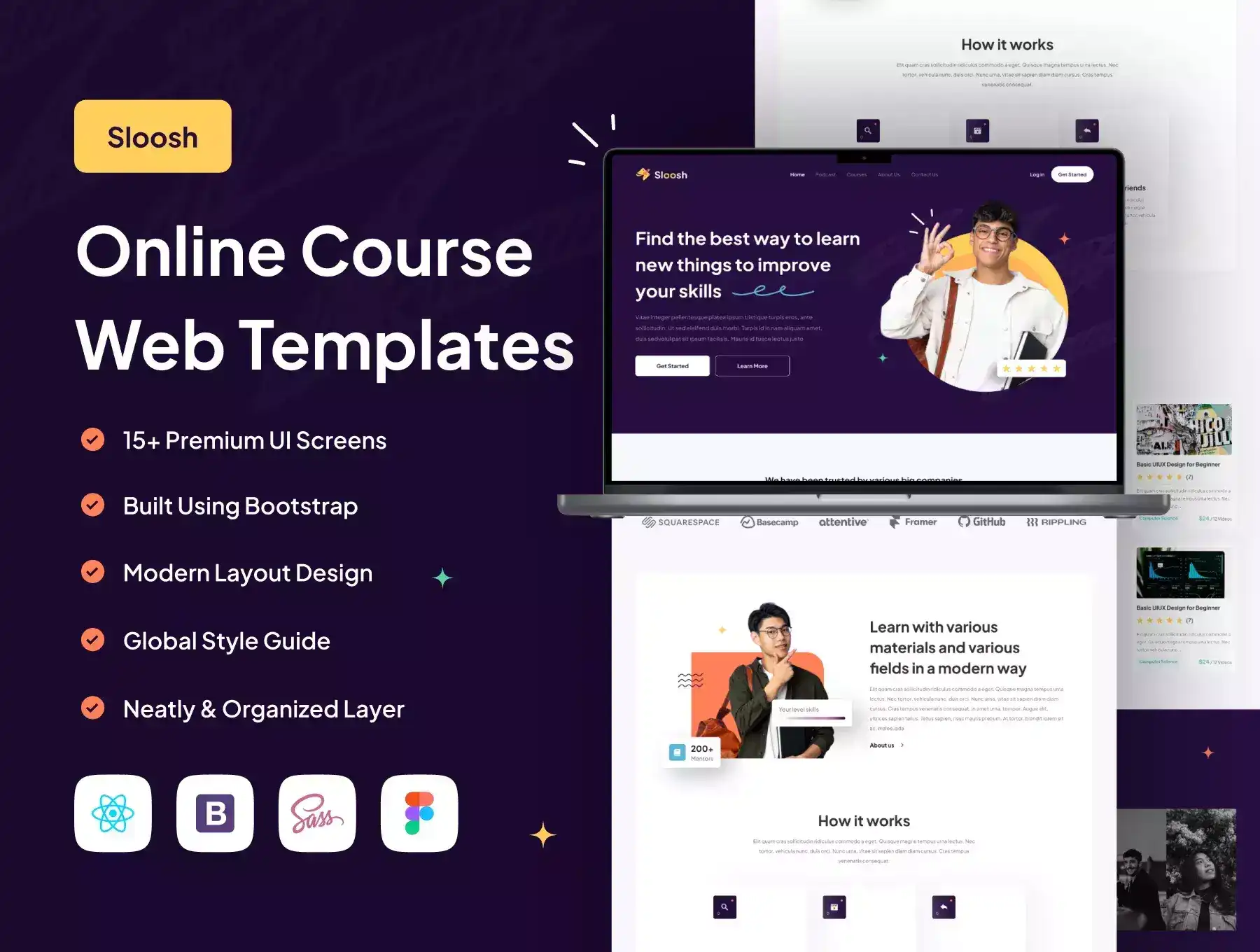 Sloosh is 15+ Premium screens HTML landing page template for Online Course website UI KIT Crafted by Using Bootstrap.