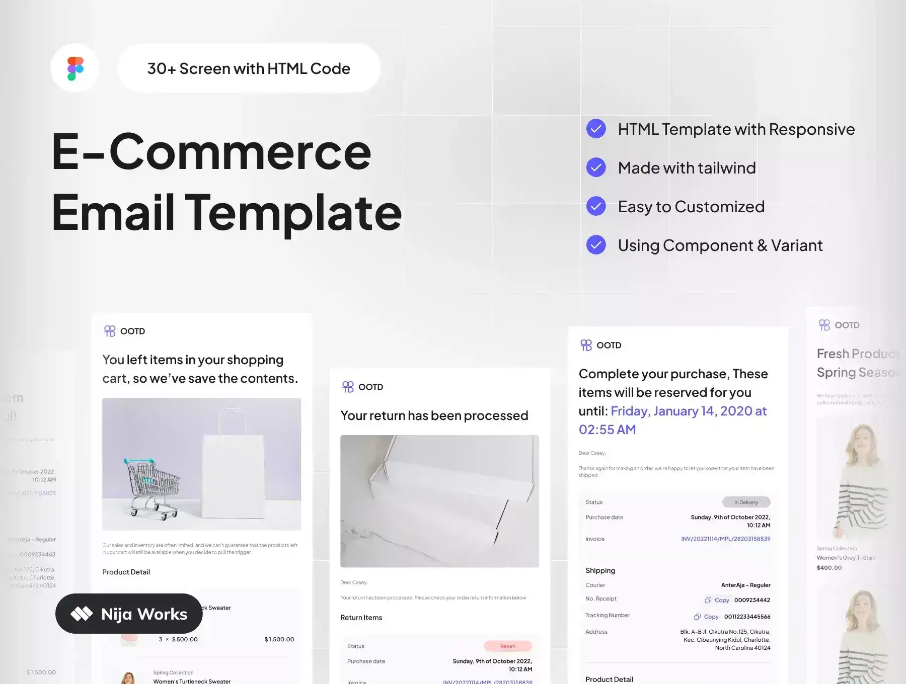 Nija Works Studio presenting our first email template kit for your e-commerce project. This email template provides with various condition for you to run your project. On boarding email, transactions, and also newsletter template to highlight updated product in store.
