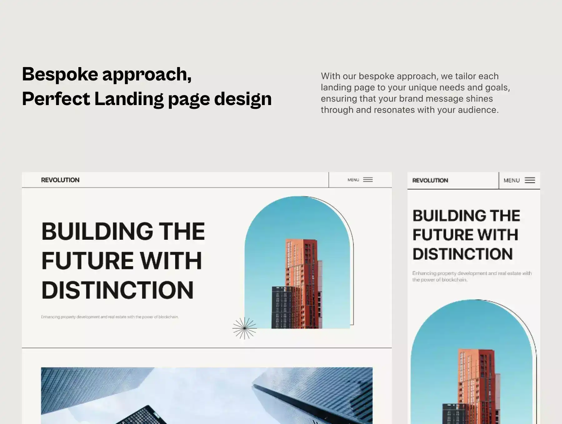 ooking for a stunning and effective way to capture your audience's attention and convert them into loyal customers? Look no further than our bespoke and modern landing page design services! Our team of expert designers has years of experience crafting visually striking and user-friendly landing pages that not only attract users but also convert them into paying customers. With our bespoke approach, we tailor each landing page to your unique needs and goals, ensuring that your brand message shines through and resonates with your audience.