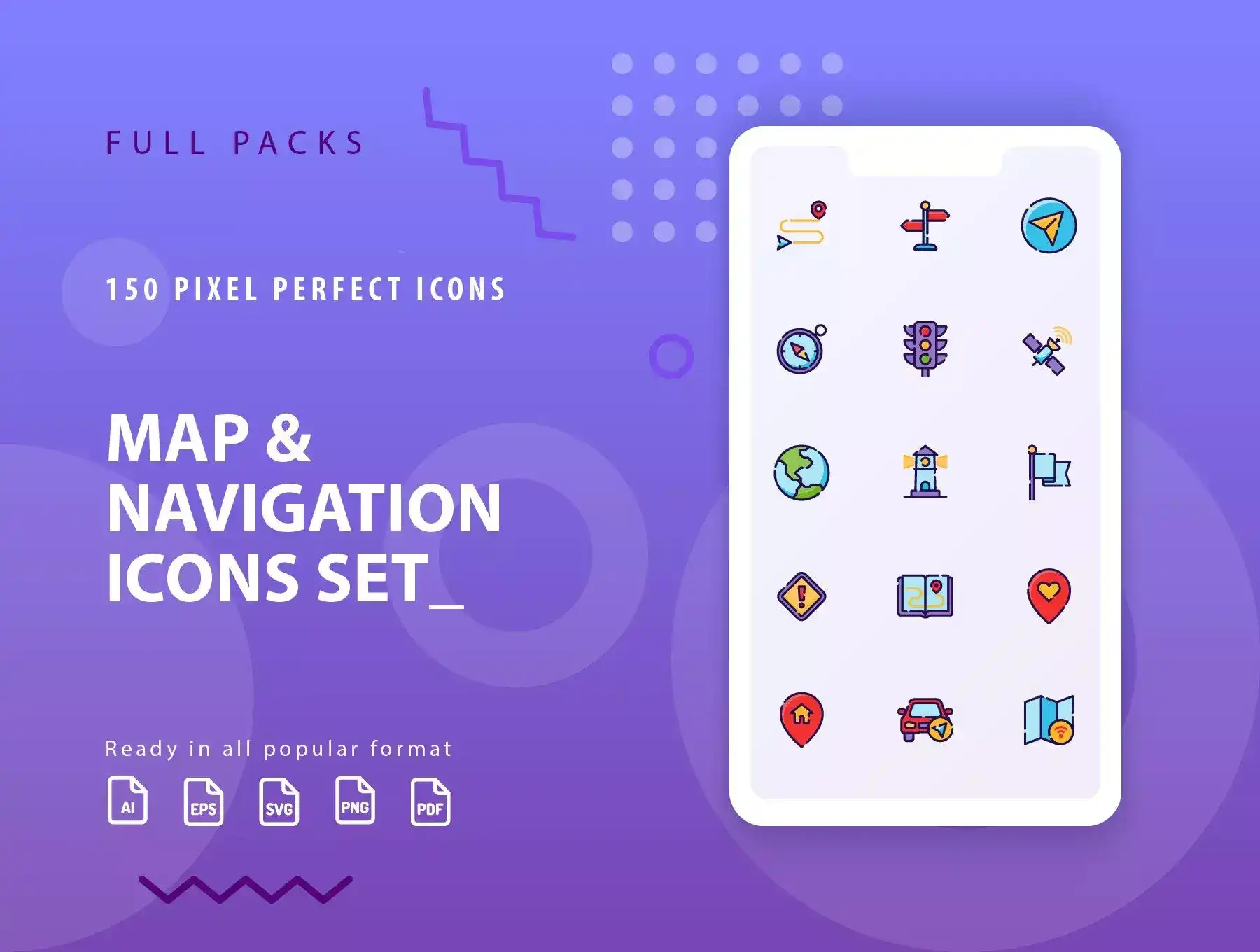 In this pack includes icons of Map and Navigation, Best Place, Book Map, Car Navigation, Compass, Destination, Direction, Favorite, Flag, Globe, GPS, Home Location, Light House, Map, Navigation, Pin, Road tracking, Route, Satellite, Search, Share Location, Traffic Light, Turn, User Location, Warning, Wifi Position.