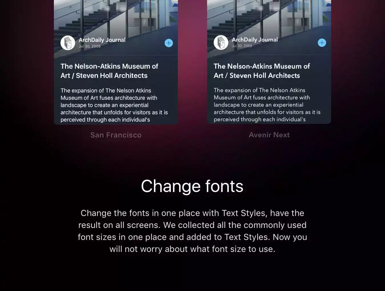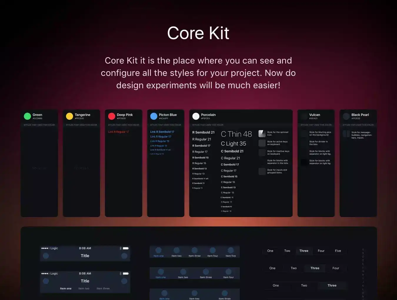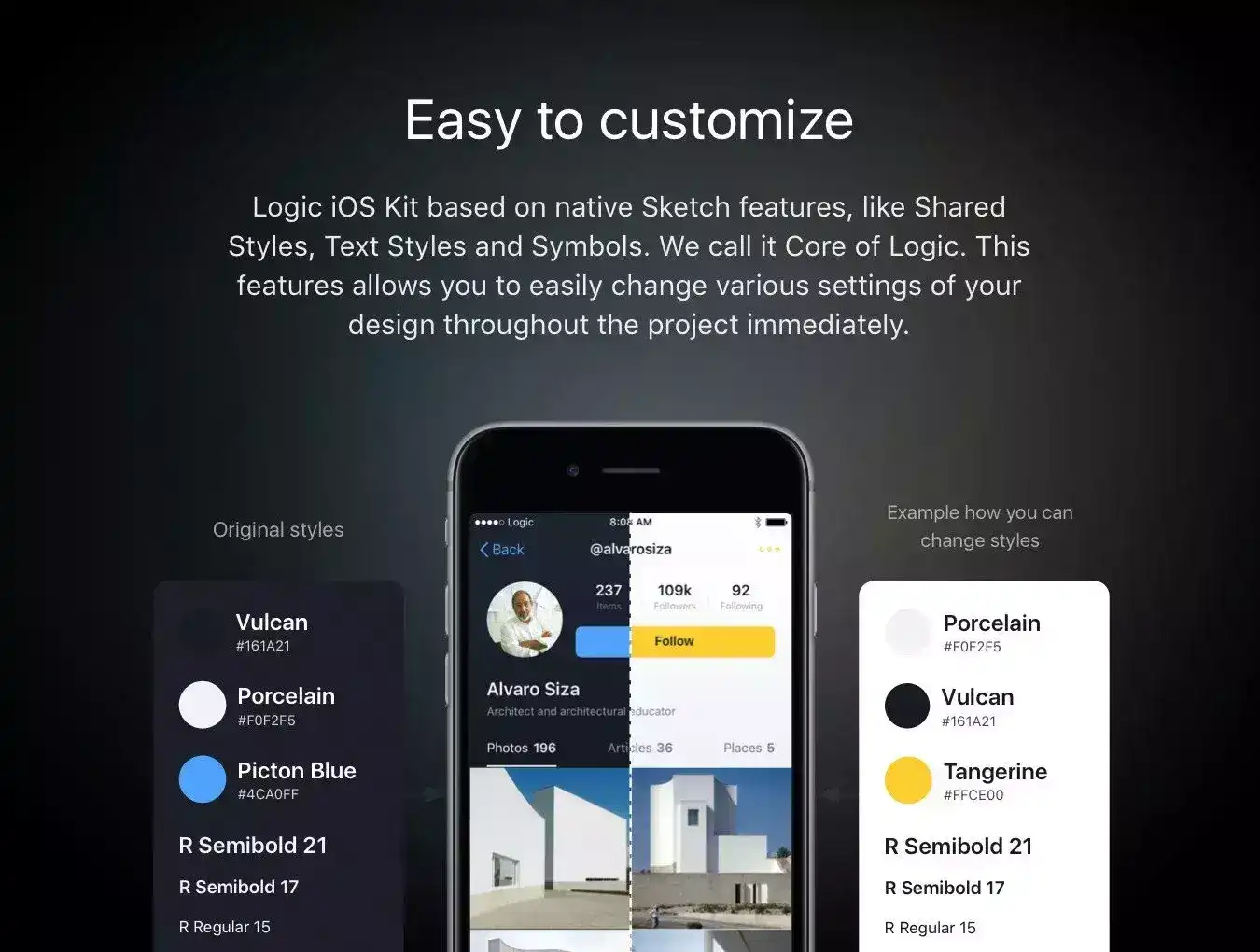 Logic iOS Kit is based on native Sketch features like Shared Styles, Text Styles and Symbols. We call it Core of Logic. This features allows you to easily change various settings of your design throughout the project immediately.