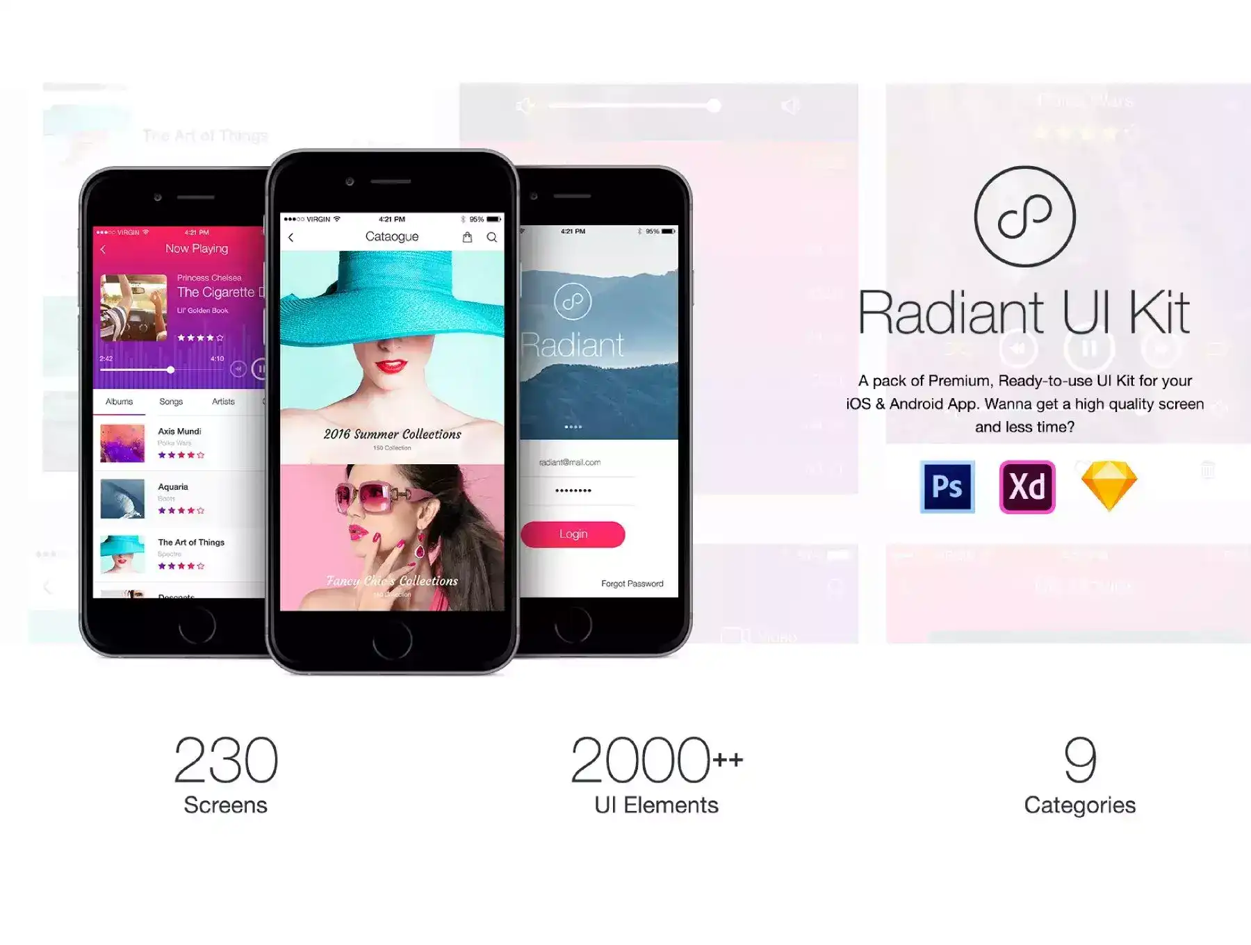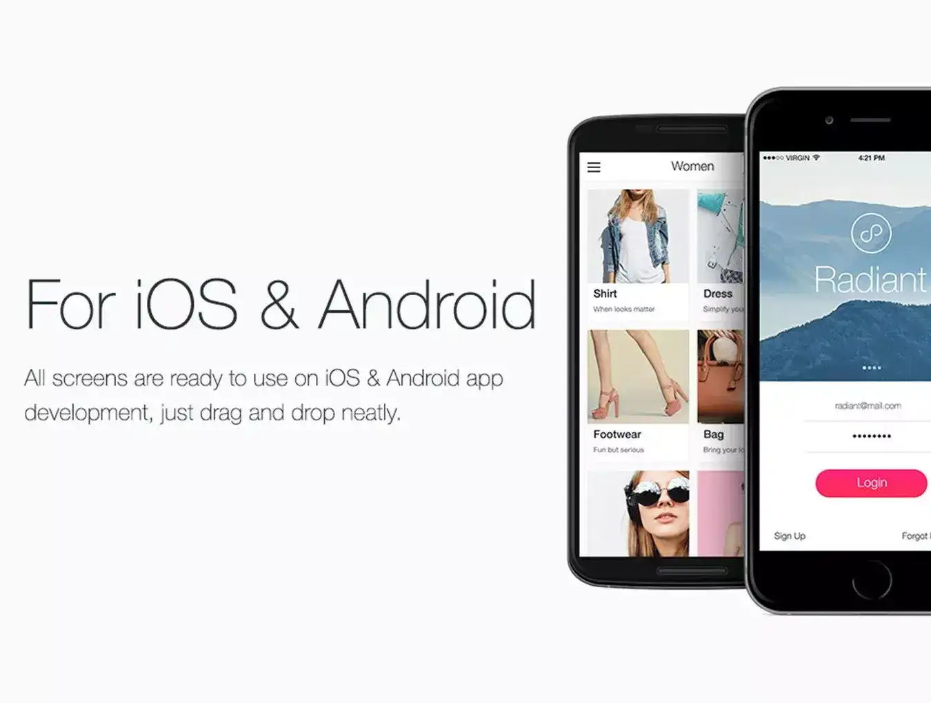 The simple layout of the app ‘Radiant’ makes your App developing process incredibly easy. It's a perfect, fresh and stylish UI Kit for building your own App. All components are shape based, fully compatible, and editable. Create new sections instantly and make a beautiful and unique layout for any desirable topic. ‘Radiant’ has been developed for those who know everything about design and delivery.