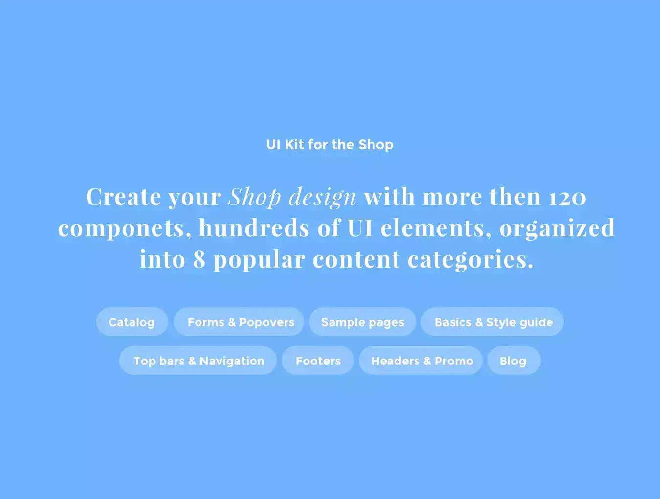 Create your Shop design with more then 120 componets, hundreds of UI elements, organized into 8 popular content categories.