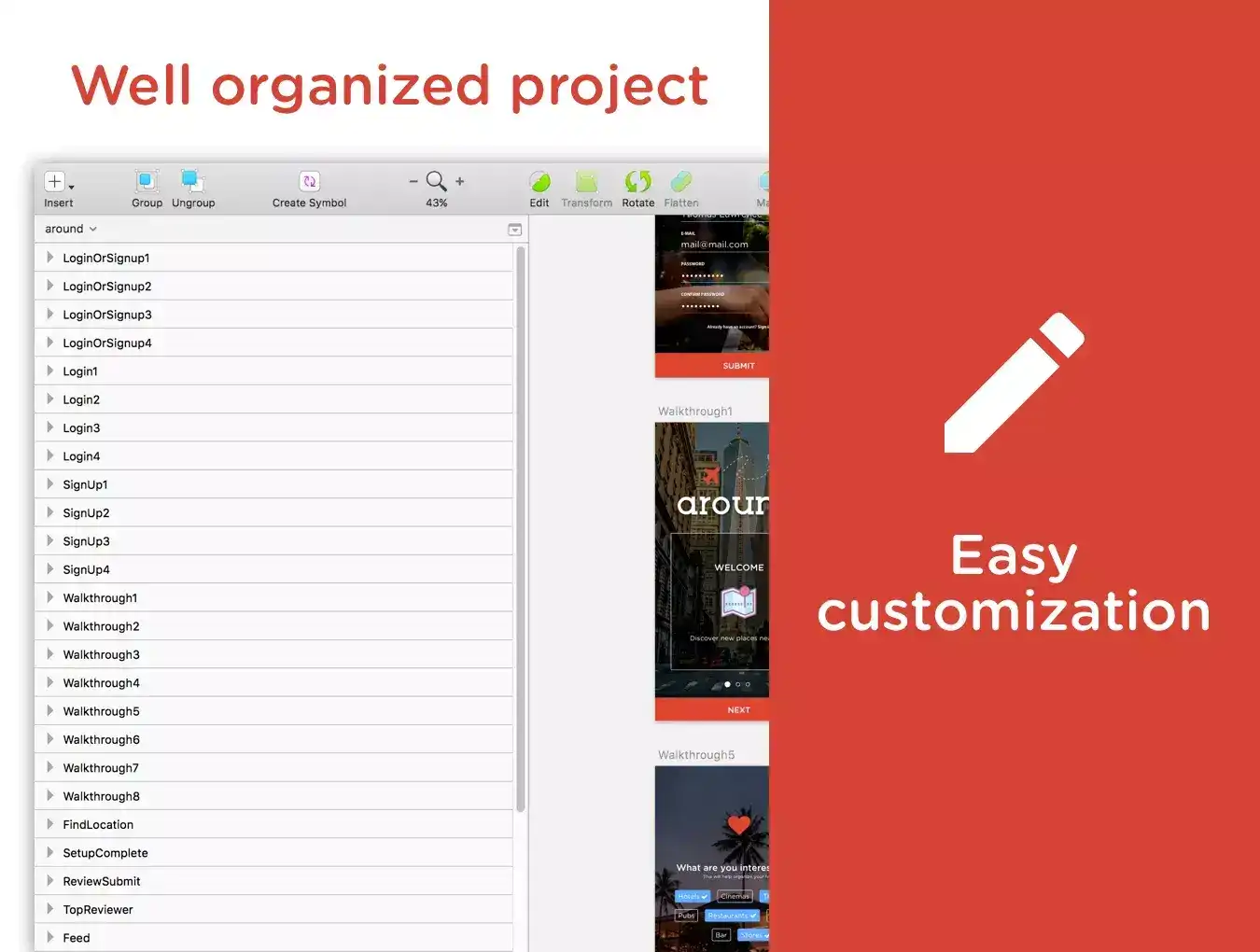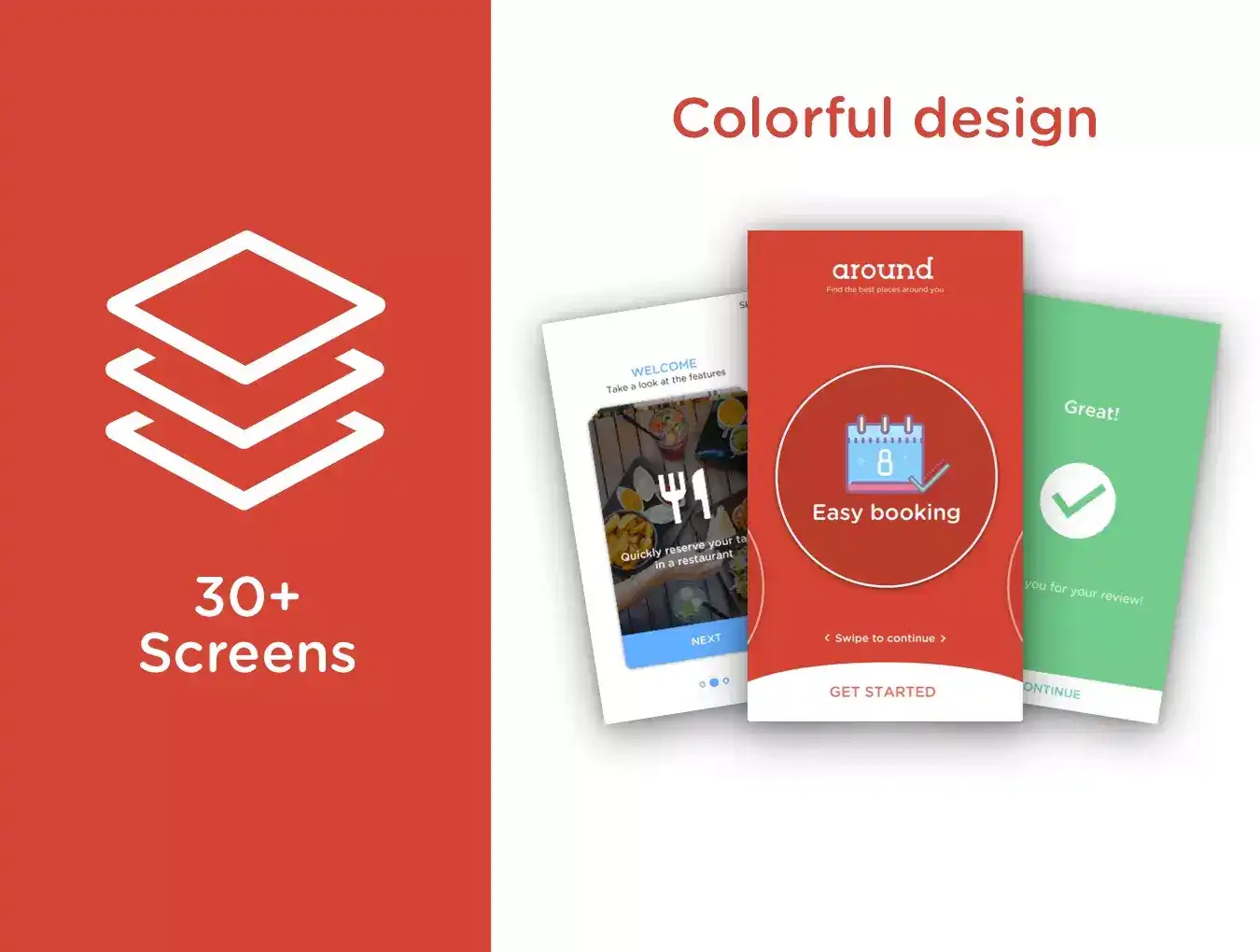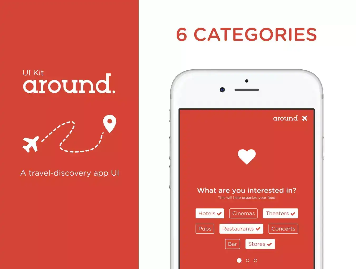 Around is a mobile UI Kit for Sketch, made for travel-discovery apps, features 30+ ready-to-use screens, fully customizable, perfectly layered and organized.