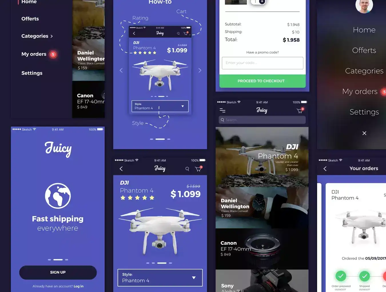 Juicy is a mobile UI Kit for Sketch, made for e-commerce apps, features 20 ready-to-use screens, fully customizable, 100% vector, well layered and organized. All the fonts used in this kit are from Google Fonts.