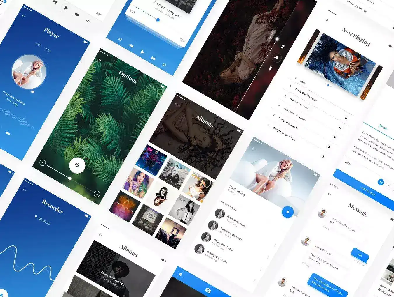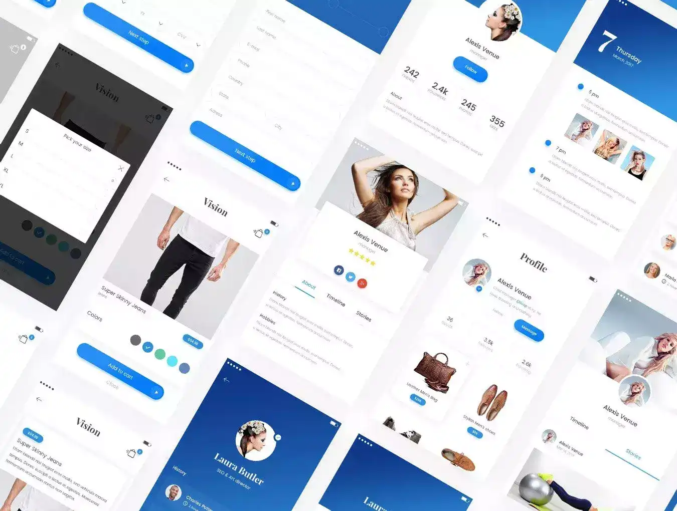 Carefully crafted trendy mobile screens for 8 categories: Sign In, Media, Social, Profile, Statistics, Walkthroughs, eCommerce, Navigation