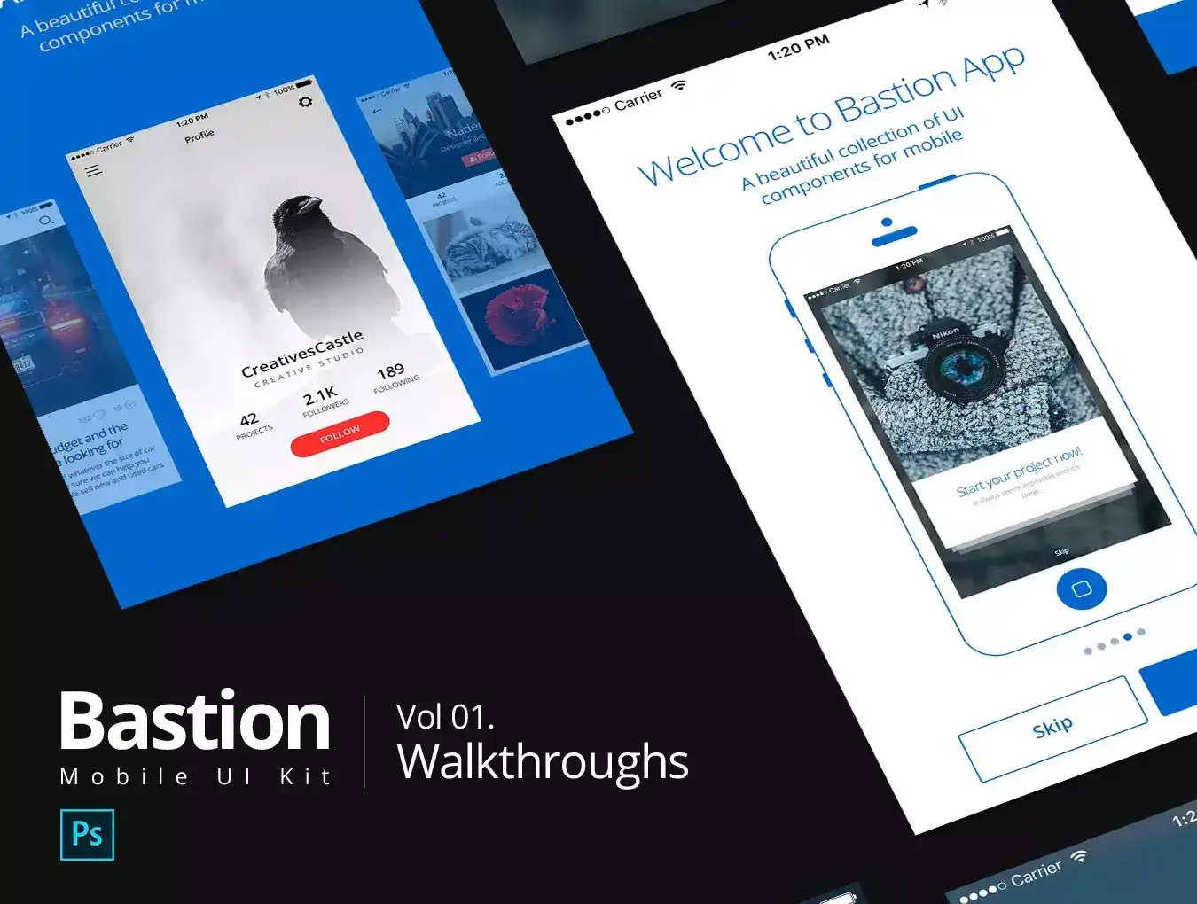 Bastion UI Kit is a collection of awesome mobile screens in 8 popular categories. This is part #01 Walkthroughs - 15 walkthrough screens for mobile, to help you in creating walkthrough screens for your mobile apps.