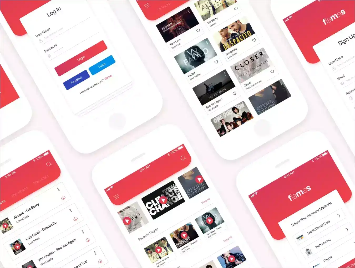 Want to create a music app for iOS? I am pleased to present you my new amazing product – Flames Musical Mobile UI Kit. It will help you design your next musical app with easy by utilizing 12+ high quality iOS screen templates. You won’t find a better starting kit than this one. This is a full package for Online Music App.