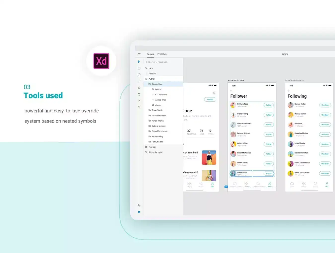 Elegant iOS fashion news App UI Kit for Adobe XD. All screens are designed for the iPhone X, with fully organized layers & easy customization.