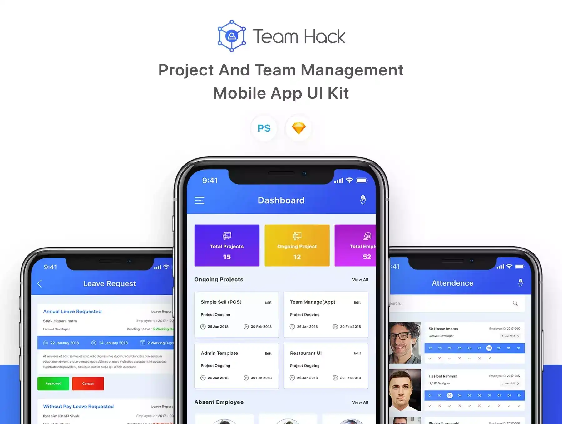 Team Hack is a team and project management App UI Kit. Included are 38+ Pages for your work. Team Hack UI Kit is compatible with Sketch and Adobe Photoshop. Team Hack make your design process super easy and fast. Customize, replace images and texts. This is completely ready for code.