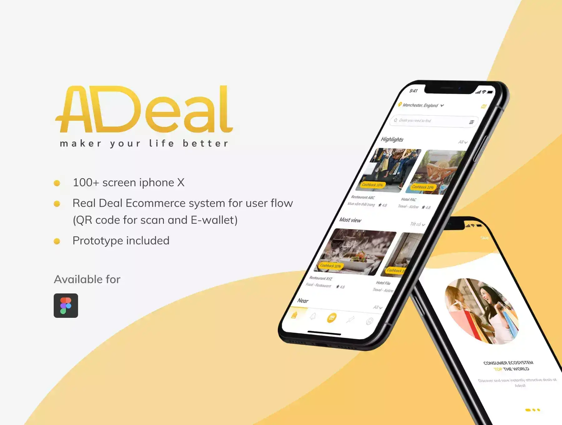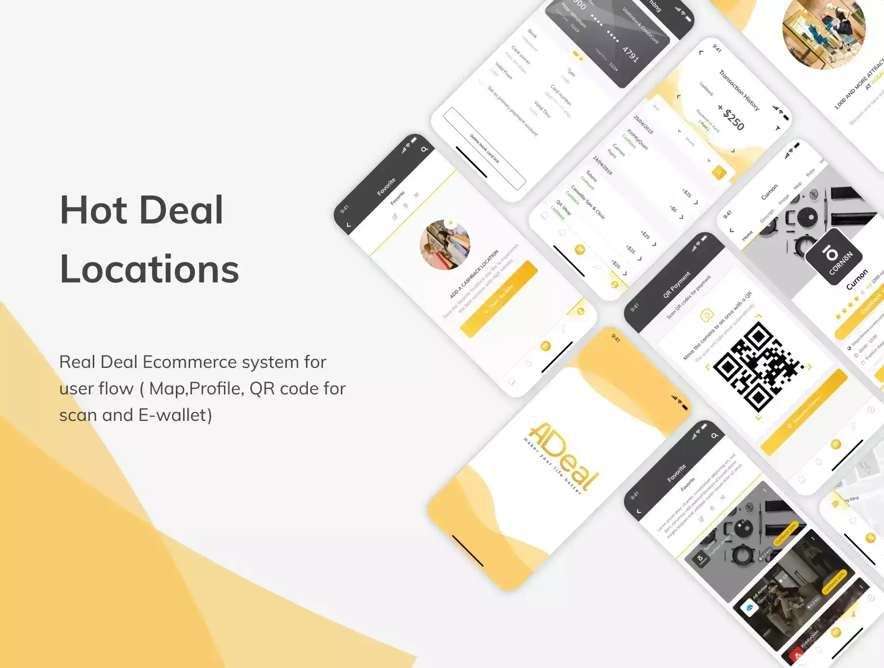 Adeal is a \u001dhot deal location e-commerce application. Project includes 100+ design screen follow: Login - Signup, Deal List, \bMap , Deal Info, User Info, Help, Contact, ..... Especially it contains Real Deal Location system for user flow - Prototype ( Map, Profile, QR code for scan and E-wallet) This kit is created in such a way so that all the components are fully customizable. All layers and Symbols are Well-Organized.