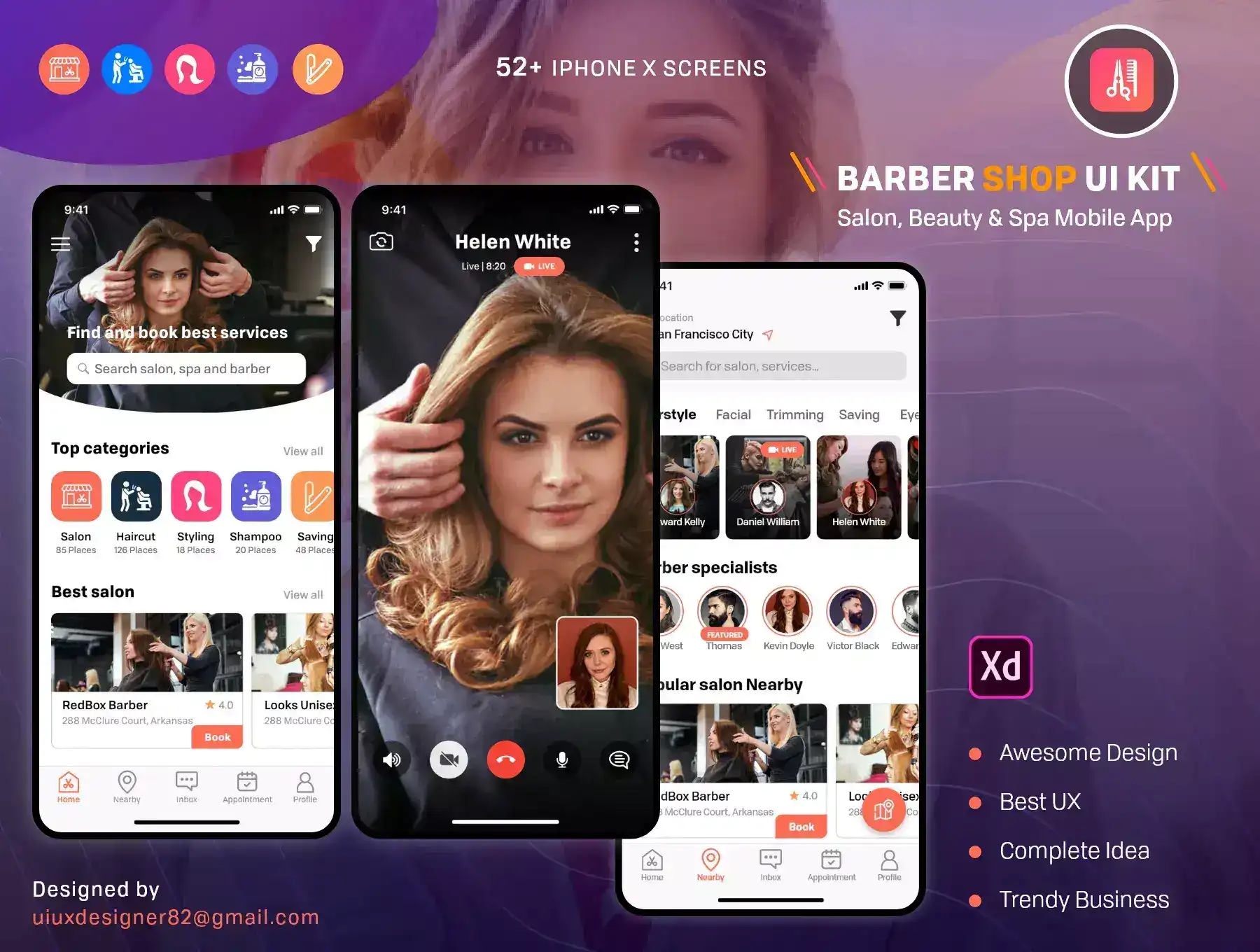 Barber & Beauty salon App is a clean mobile iOS UI Kit, perfect for Salon, barber, beauty & spa related applications includes 52+ high quality iOS screen templates designed in Adobe XD. This modern design template is easy to customize, making it even easier for you to design your next App. Each screen is fully customizable and well organized in symbols and this is completely ready for code.