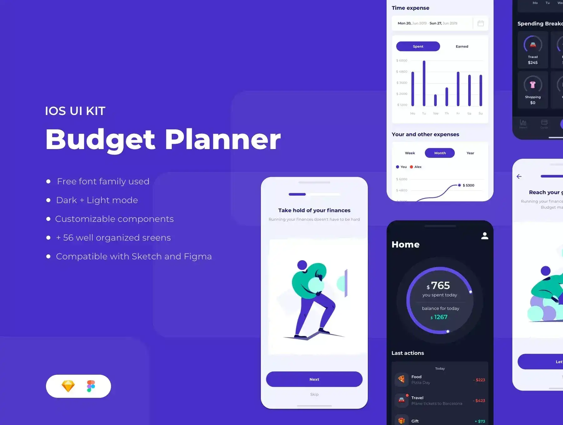 The kit allows you to customize the app according to your needs. Lovely illustrations provide a pleasant and entertaining experience. For demanding users there is a dark mode to interact with the app more conveniently.