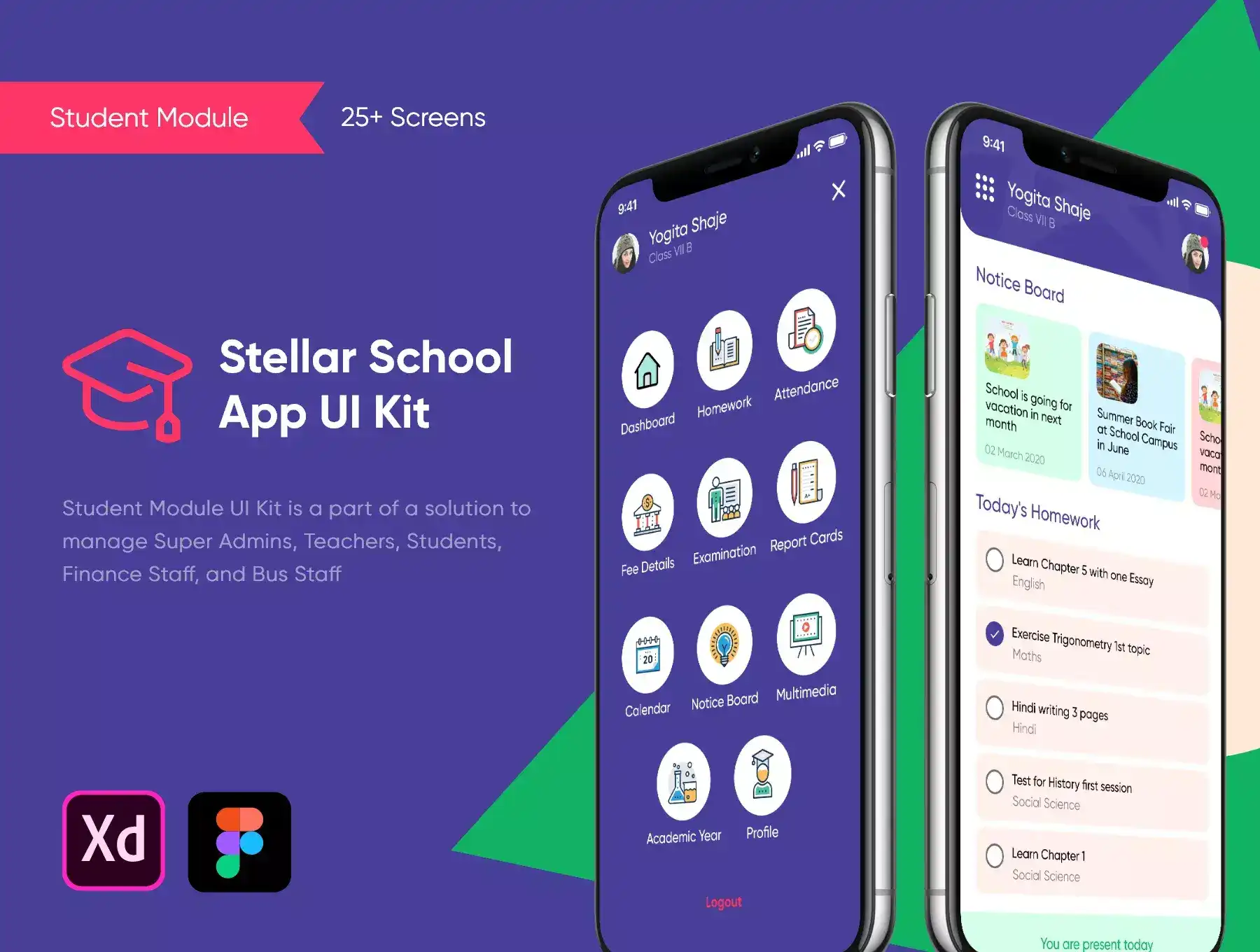 Stellar School Management Mobile App - Student Module UI Kit is a part of a solution to manage Super Admins, Teachers, Students, Finance Staff, and Bus Staff. These different mobile apps will give fruitful user experience to their stakeholders. This UI Kit contains ready to use components, Typography, Design System, and customizable Color Palette. With 25+ Unique Layouts, we covered almost every aspect of a Student App would require. This UI Kit is available for both Adobe XD and Figma.