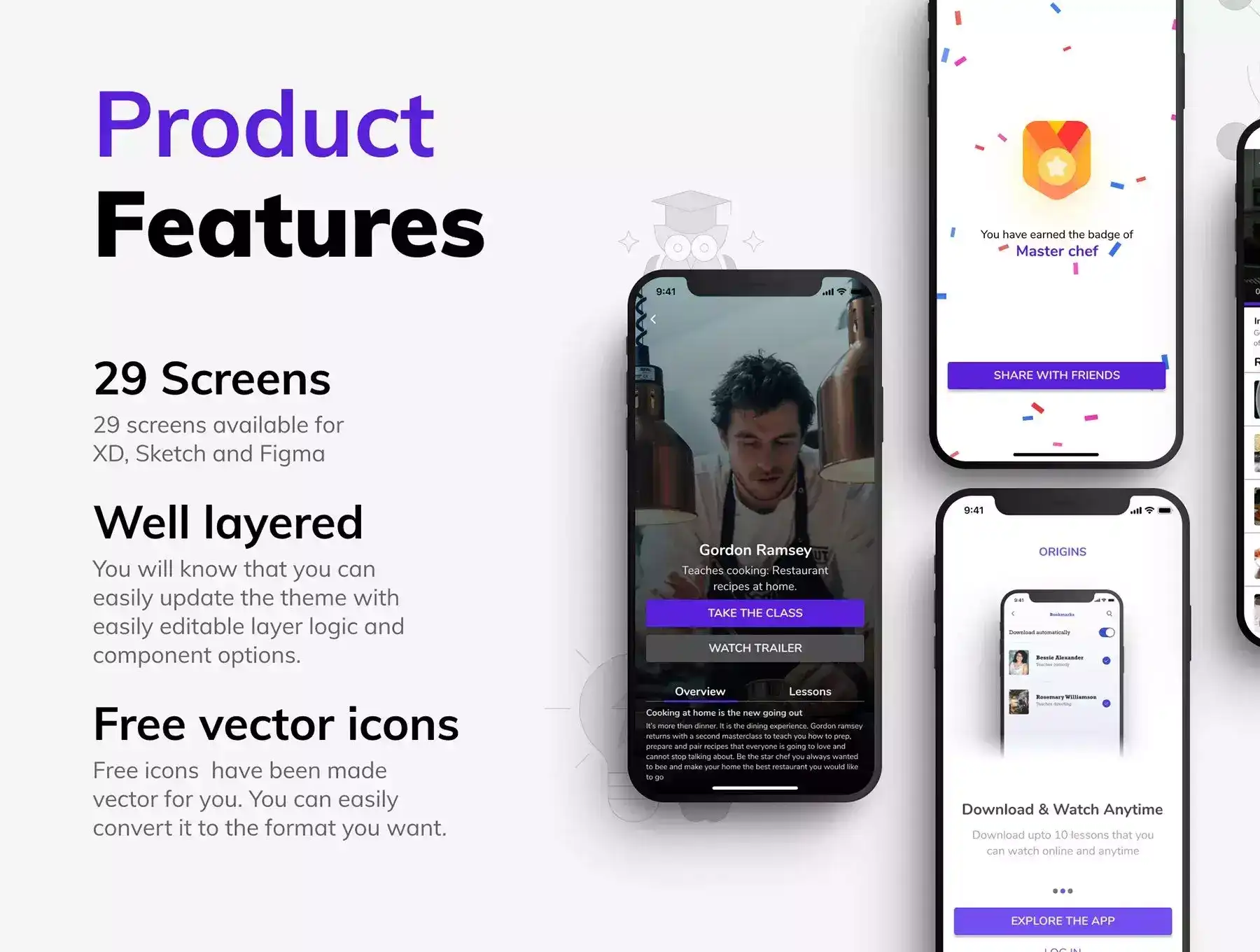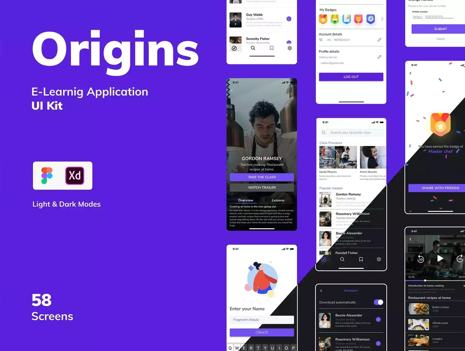 Origins Mobile App UI Kit is an educational app focused on improving the experience of learning courses online. This UI Kit contains unique UI components & 58 UI screens (29 screens each theme). Dark & Light modes. Compatible with both Figma and Adobe XD.