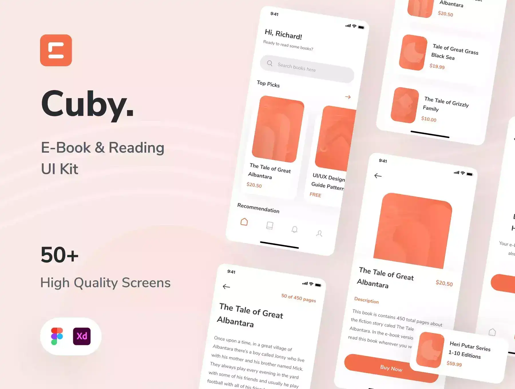 Cuby is an e-book store and e-book reader app UI Kit with a clean and sleek style contains 50+ high-quality screens and with a responsive resize features for iOS with iPhone X screen size (375px X 812px) ready to use and ready to kickstart your design process.