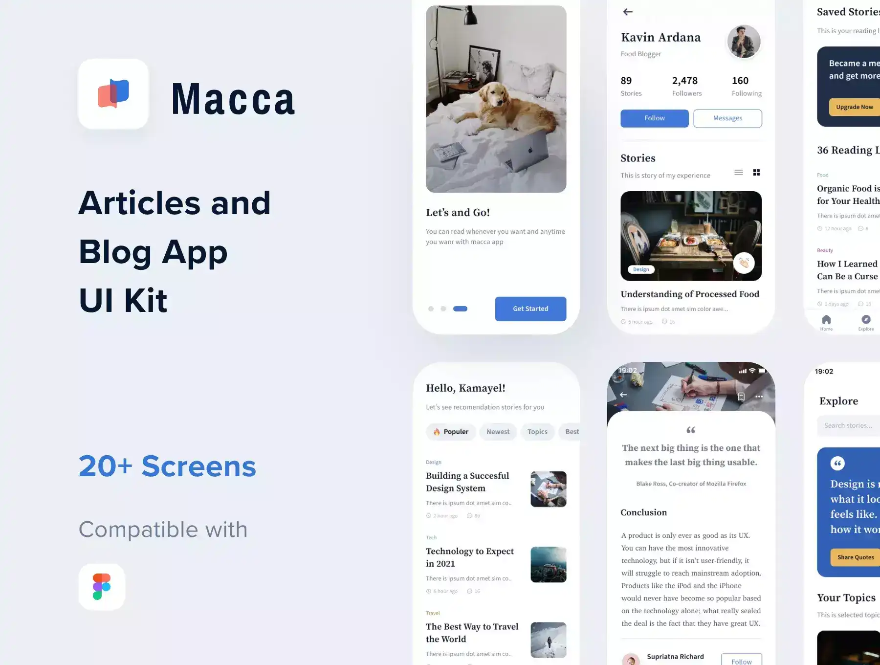 Macca is an article/blog app as well as a hybrid iOS app design platform. Most of the section’s design can be used for another platform easily.