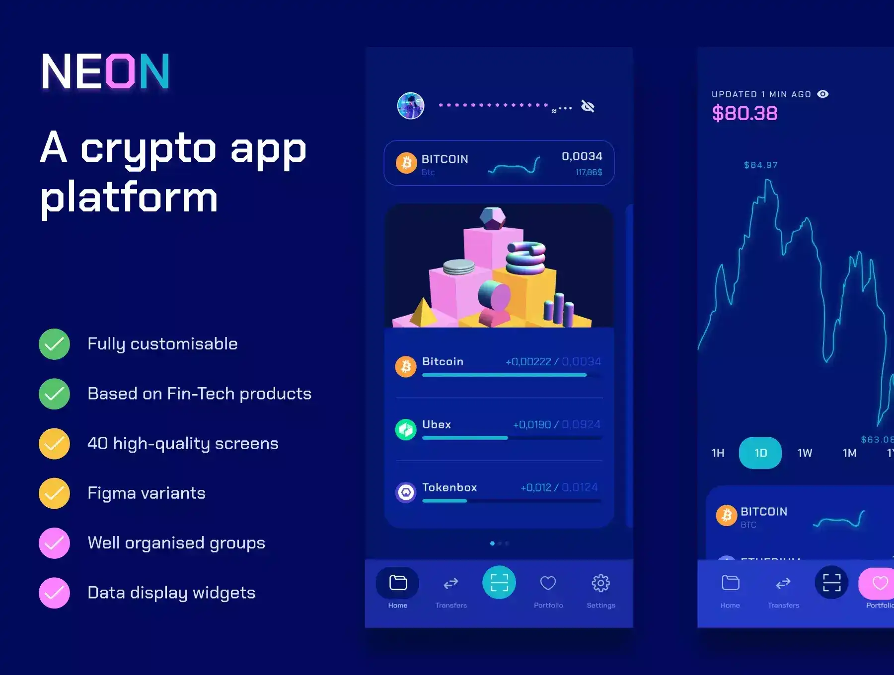 Neon is a UI kit for a secure crypto-buying wallet. Contains charts, wallet UI, market stats, ios widgets, Figma variants allow the creation of a lot of combinations. Well organized, trend style. Fully customizable user interface based on Fin-Tech product design.