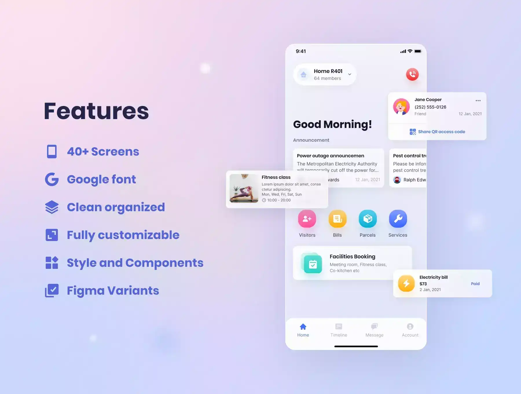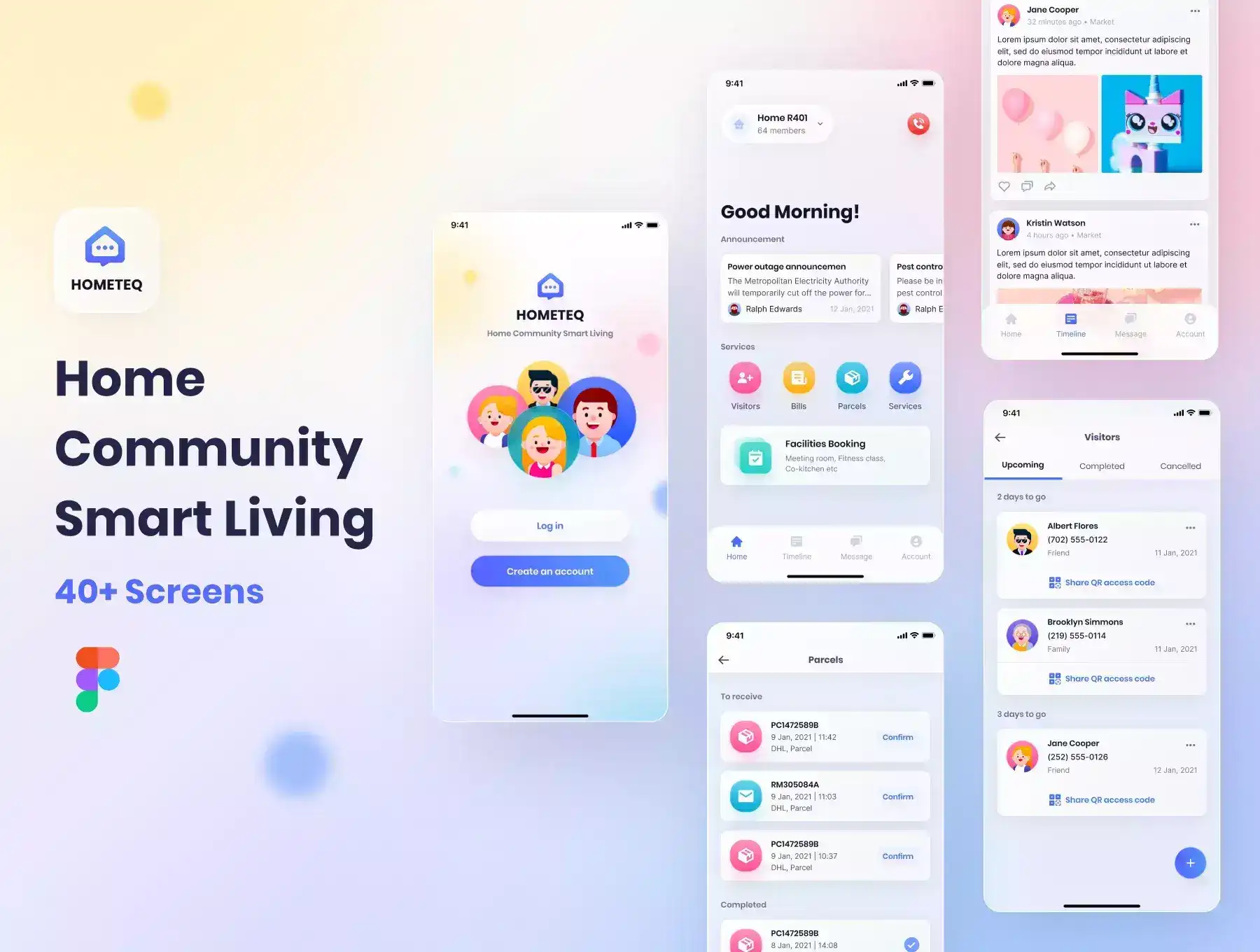 HOMETEQ is a modern, clean and trendy UI Kit for smart resident management. The components are made up of styles, auto layout, and Figma variants, which are easily customizable.